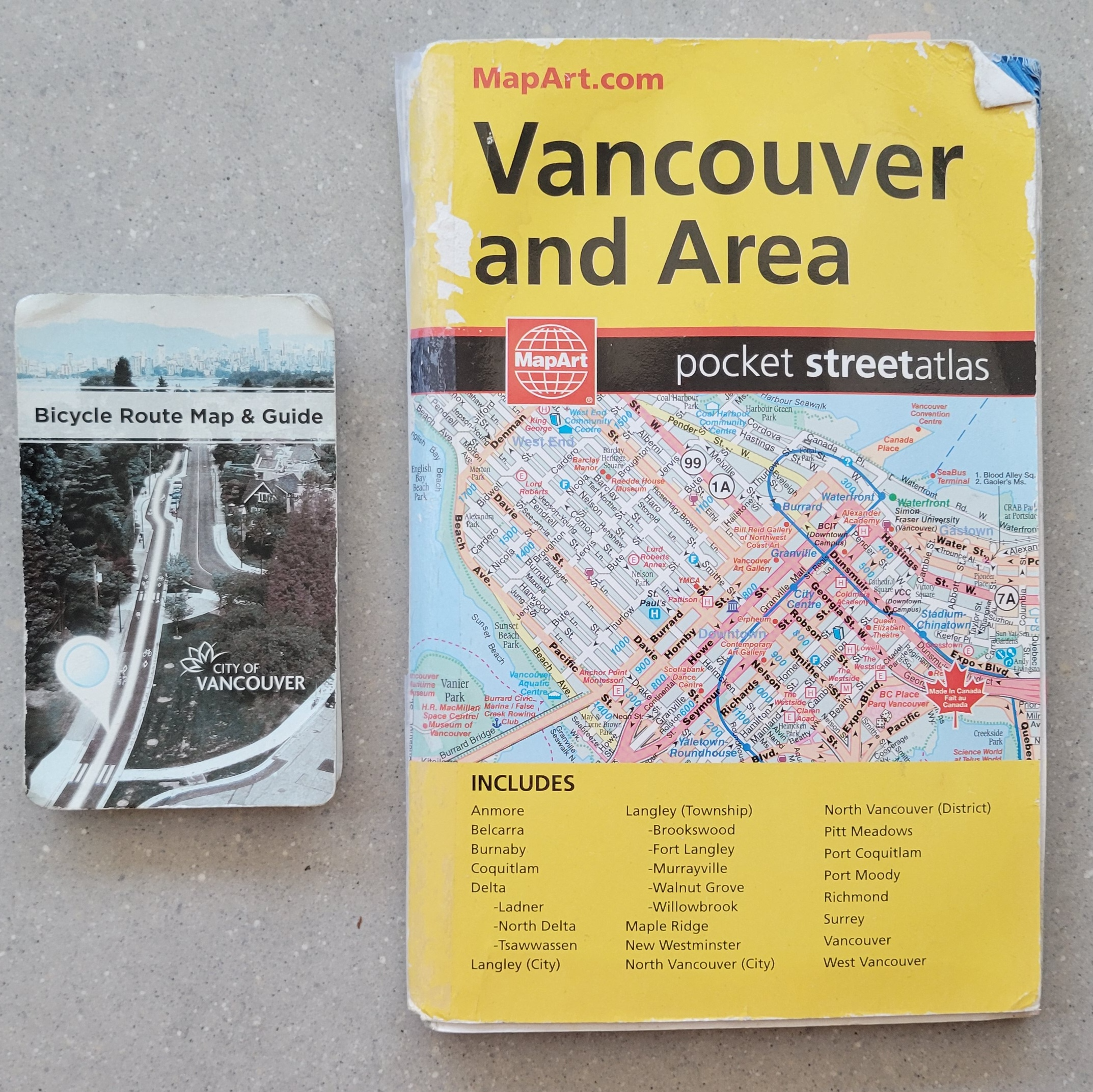 Other reference maps include road atlases, pocket atlases, or transport specific maps such as the below cycling map of Vancouver and Montreal. The reference map most often used in your everyday is Google Maps.