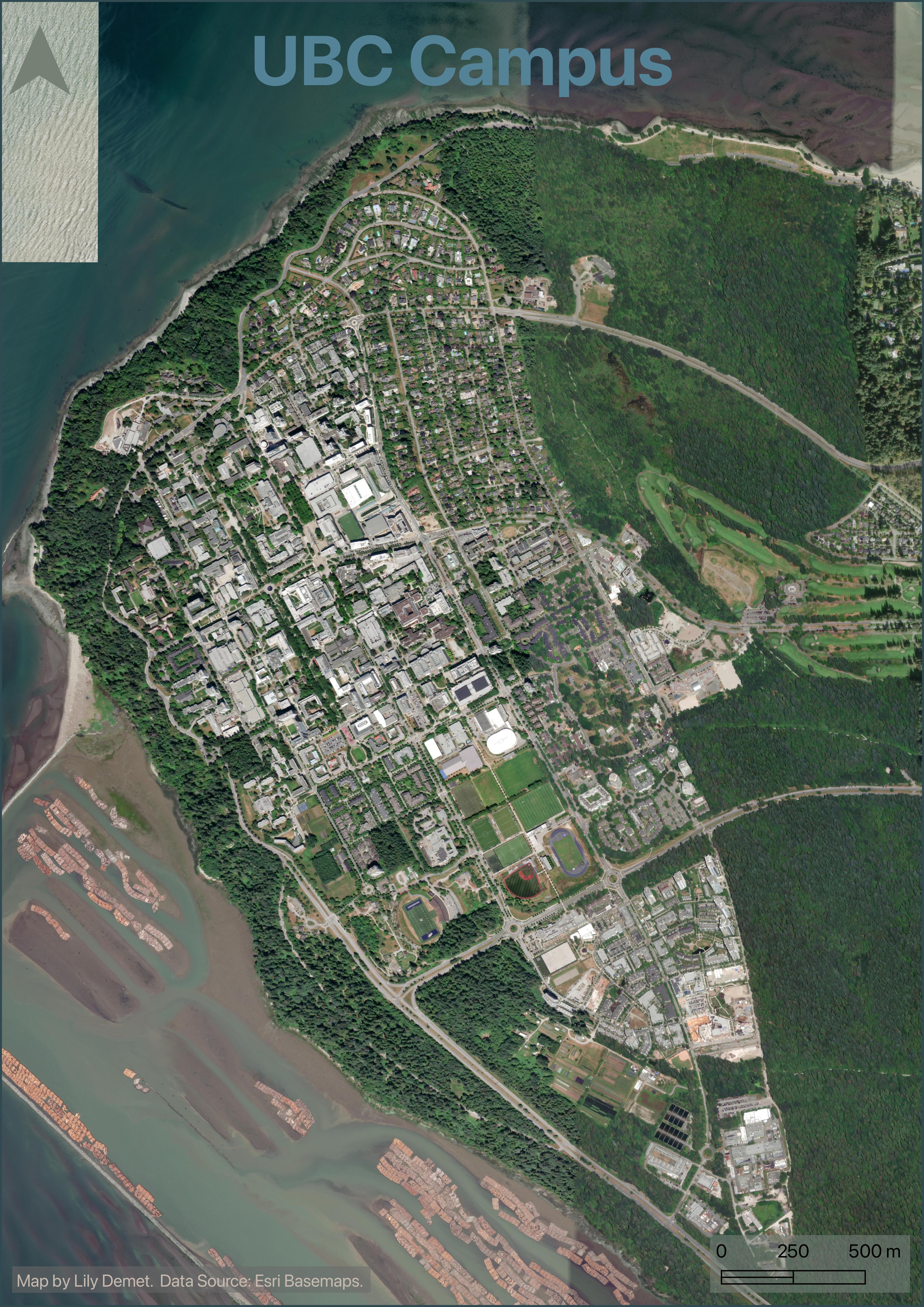 Reference maps show the lay of the land, such as the geographic context surrounding your research location or area of interest. Reference maps can be as simple as a drop pin location, or more complex with data layers, labelling, and insets. Reference maps, like any map, should have at minimum an explanatory title, north arrow, scale, legend, map author and data source statement. If there are only one or two data layers which are intuitively symbolized and clearly marked, a legend is sometimes unnecessary.