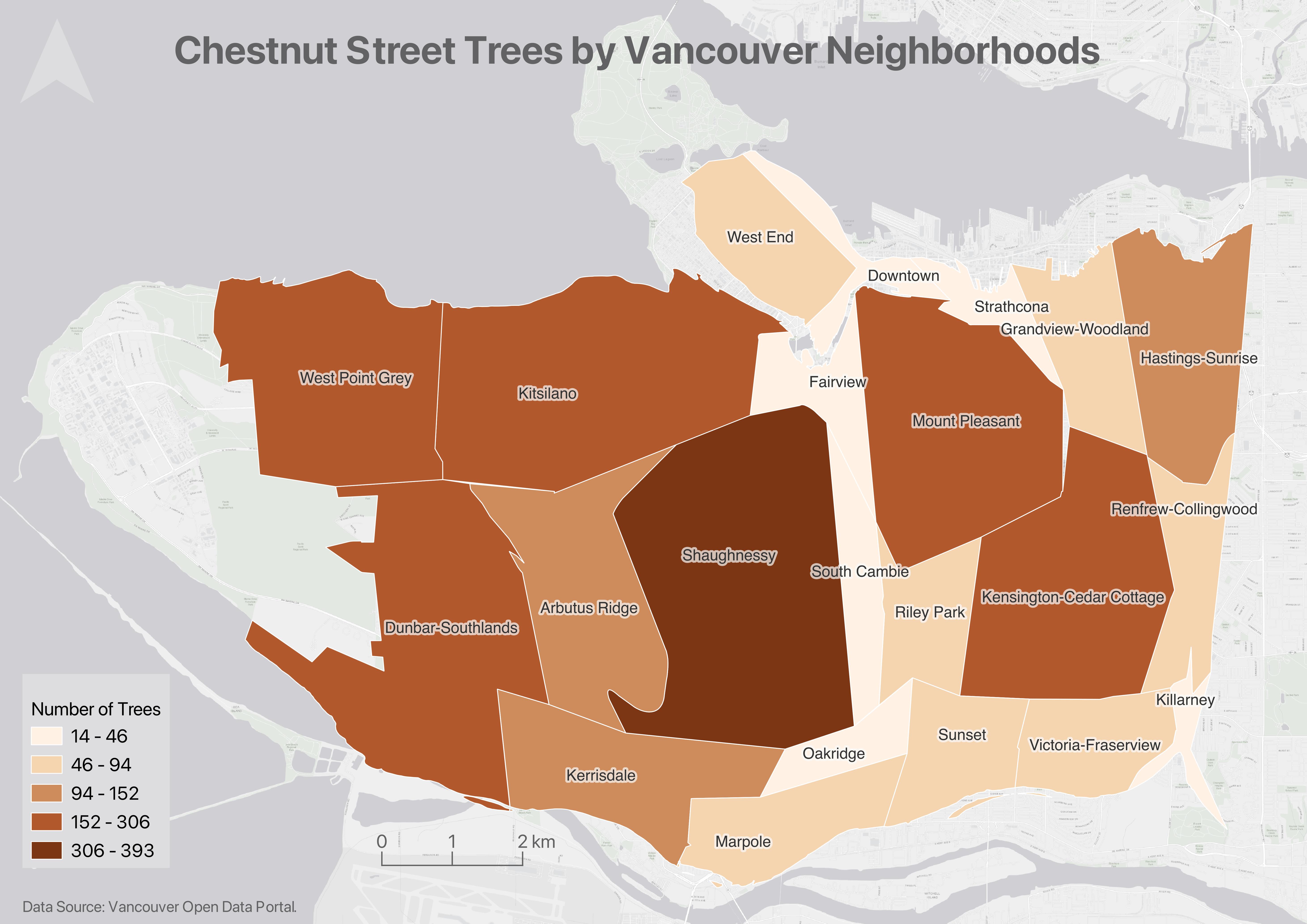 Choropleth maps are useful to show and compare the density, frequency, or quantity of a value generalized across standardized geographic areas (such as zip-codes, provinces, or countries). Unless you specifically want to emphasize differences in total number of events/data points, it is best practice to normalize your data when choropleth mapping. Normalization is when you divide the values for each geographic area by something like the area in square kilometers or total population of that area. For instance, mapping winter flu cases across census tracts in British Columbia, you’d want to normalize the total cases in each census tract by that tract’s total population. Normalization enables better comparison across multiple geographic areas.