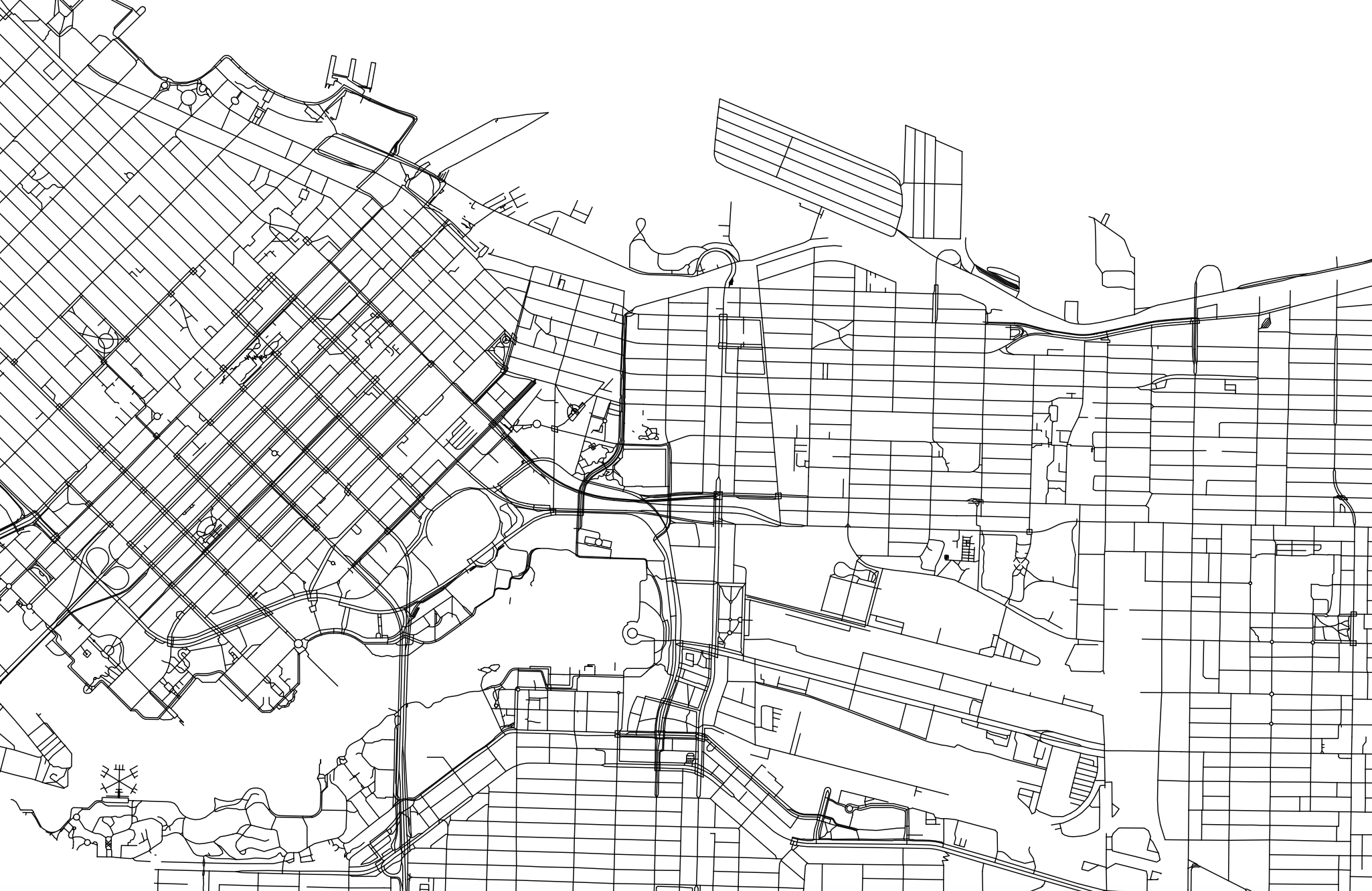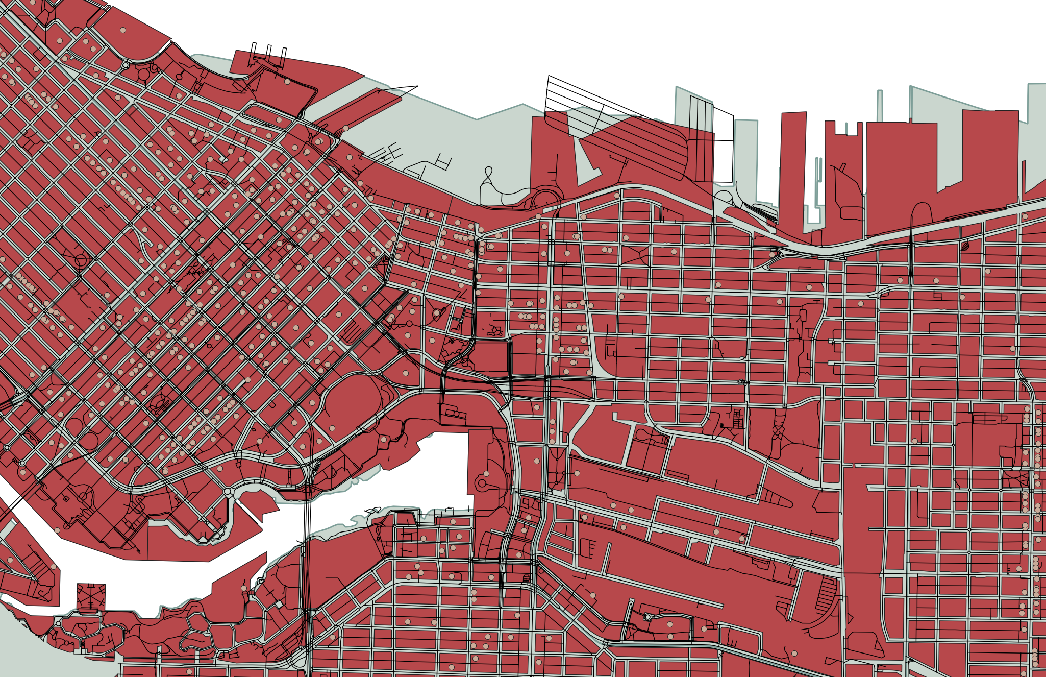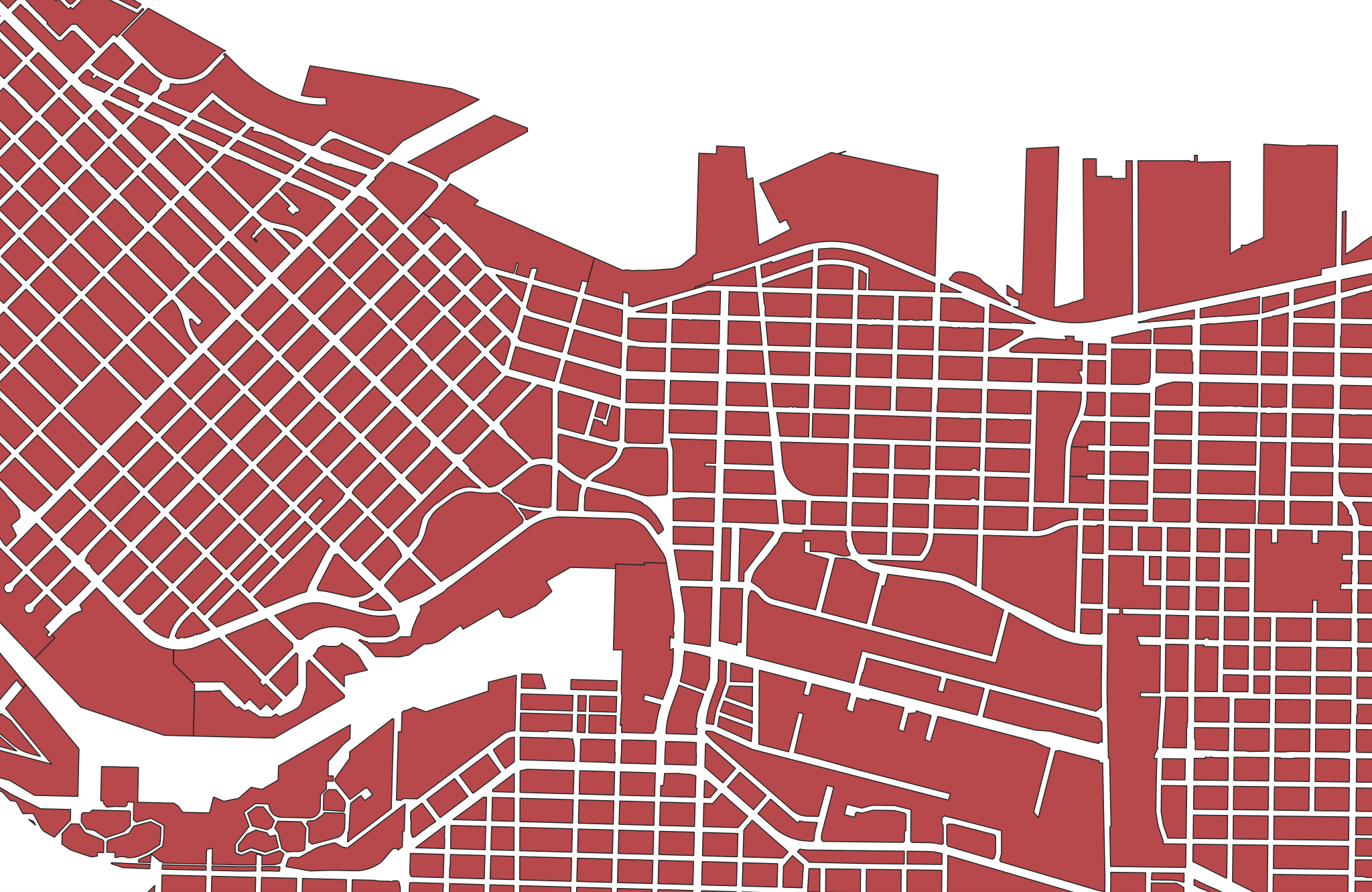 Each vector dataset will contain either points, lines, or polygons. However, a dataset can include multiple features (multiple points, or multiple lines, or multiple polygons). For example, below are a handful of vector datasets, including Vancouver neighborhoods (polygons), city blocks (polygons), restaurants (points) and streets (lines). A Geographic Information System allows you to add multiple datasets, layering them on top of each other in order to run calculations between them. For instance, in a GIS, you could load in the below datasets and then use spatial analysis tools to learn how many restaurants are within a 5 kilometer radius of a given city block, or the square area of each neighborhood.