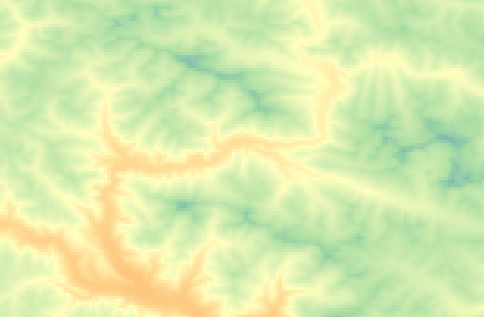 Rasters, on the other hand, can generally only store one value per pixel. This value could be a color representing different kinds of topography (think of the whites, greens, and browns representing different elevations in the image below) or the quantity of something like rainfall or temperature. Multiple rasters can be overlaid to generate a multi-part raster, but generally, each pixel of a single raster can store one value meaning your raster is showing one variable. You can also do math between raster layers, or run boolean operations to isolate all pixels that do or do not meet certain criteria. An example of this is Suitability Analysis.