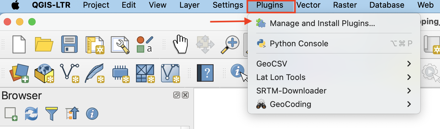 QGIS plugins are user developed tools that extend QGIS functionality beyond the basics. To access basemaps, we’ll first install the QuickMapServices plugin. Click on the Plugin menu at the top of your screen and select Manage and Install Plugins…