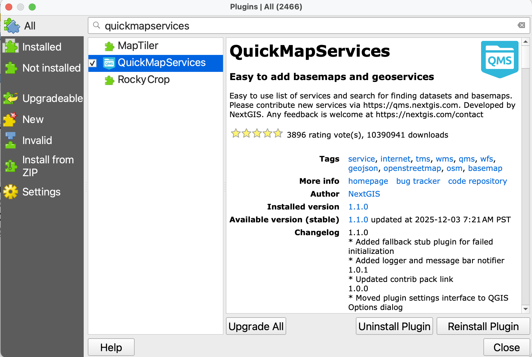 In the dialogue box that opens, select All as a search category on the left and type “QuickMapServices” as one word. Install the plugin and close the dialogue box.
