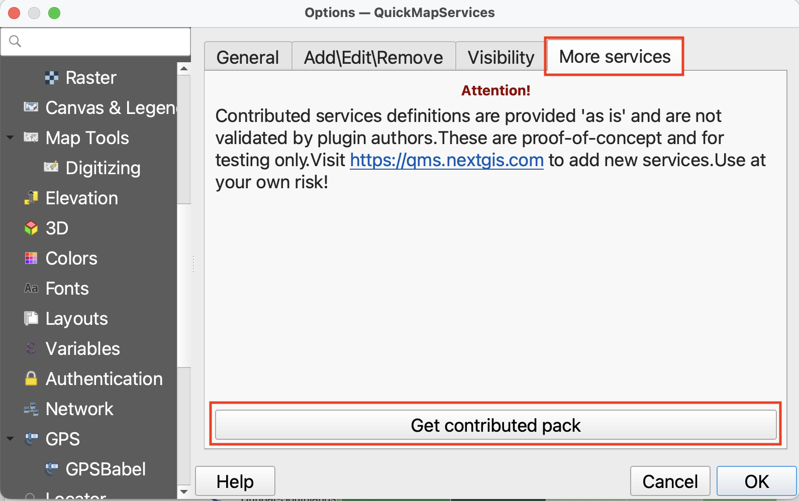 Now go to the Web menu at the top of your screen. You should see the QuickMapServices plugin. Hover over it and click “Settings” at the bottom of the menu that pops up. In the settings dialogue box go to the “More services” tab and click “Get contributed pack.” Click save to close settings and return to the Web menu. This time when you hover over the QuickMapServices plugin you will see an array of basemap options. Select OpenStreetMap as your basemap. Like QGIS, Open Street Map (OSM) is open source and user developed.