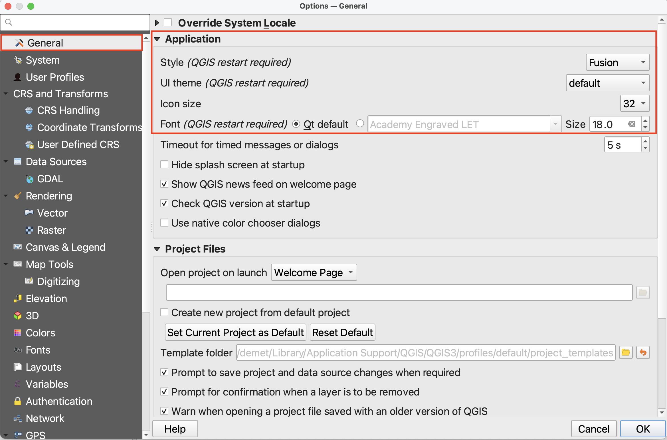 Increasing font and icon size - Make sure to resize the Options dialogue window so you can see the drop-down for “icon size” and “font”. (It is particularly difficult to see QGIS drop-down and close window icons in dark mode.) Now you can increase the font and/or icon size. Icon changes will happen as soon as you click OK. Changes in font size won’t update until you quit and restart QGIS, so make sure you save your project now.