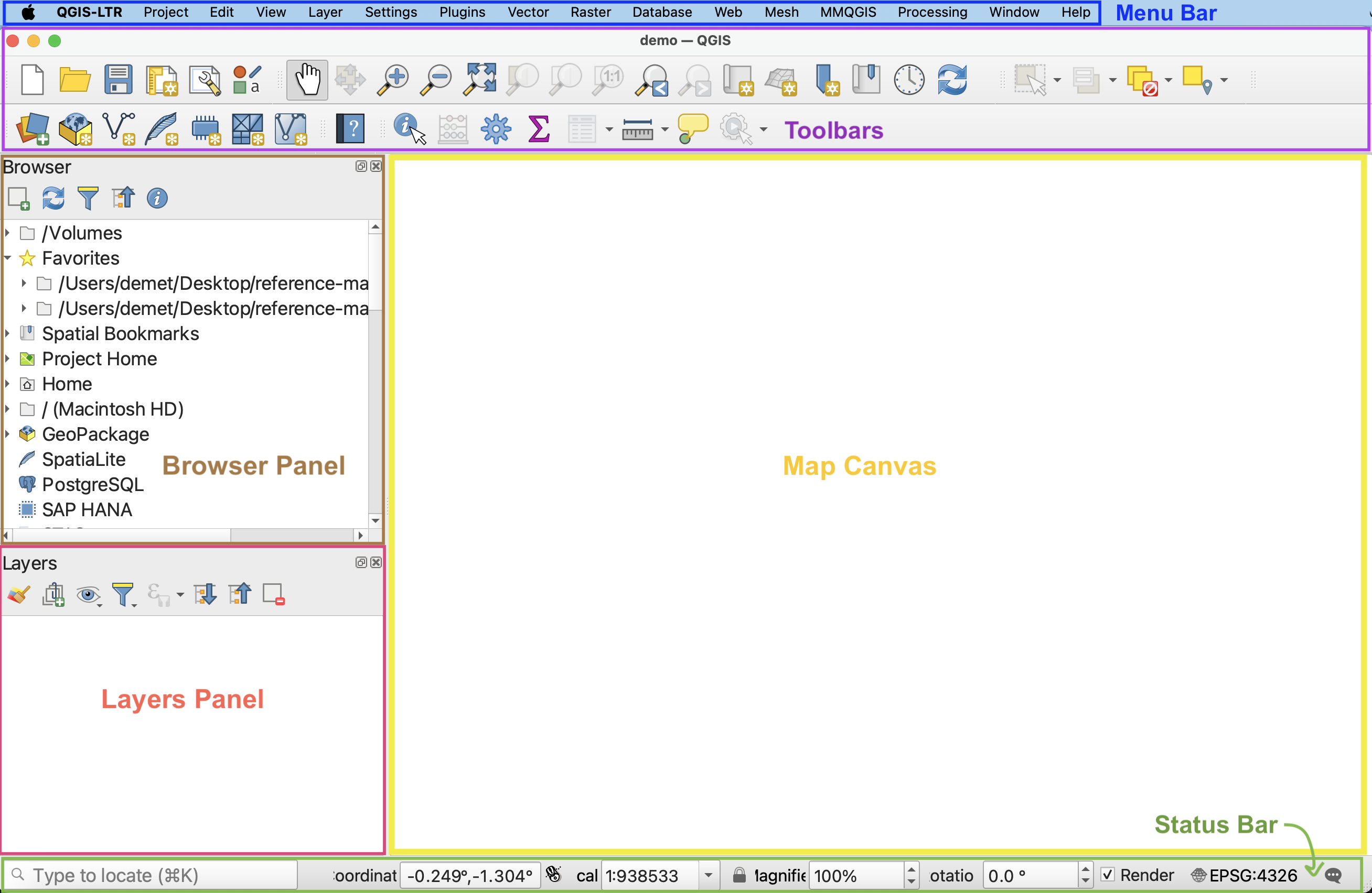 Now, double-click the QGIS project to open it. If you have successfully downloaded and installed QGIS, the application should open and look like this: