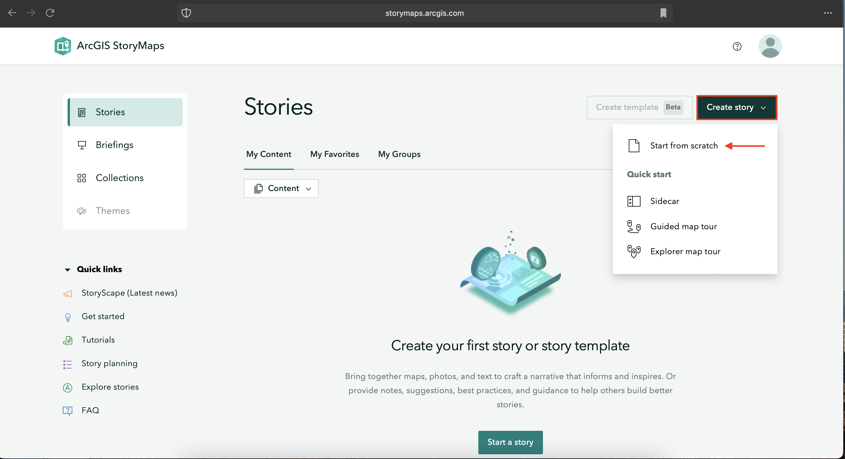 Alternatively, you can create a new StoryMap from the ArcGIS Online homepage by going to Content (in the top banner) and clicking Create app. From here, select ArcGIS StoryMaps and you’re good to go.