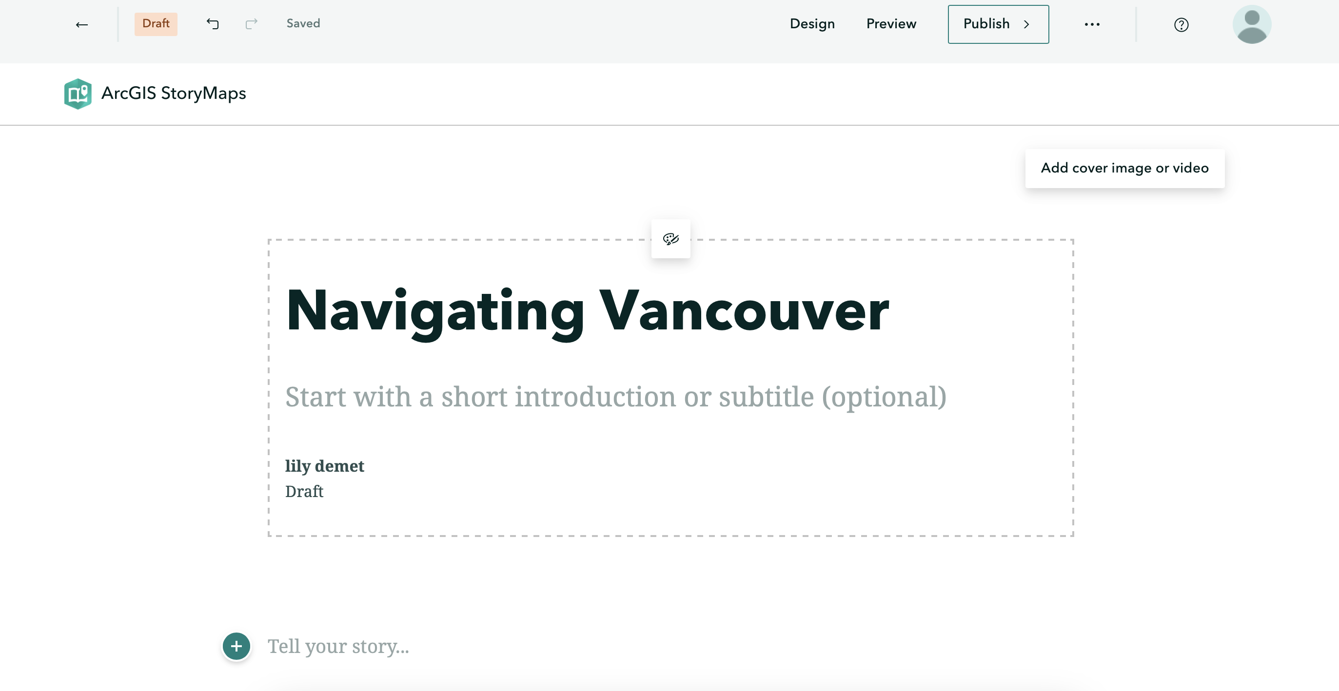 Go ahead and give your StoryMap the title: Navigating Vancouver. You’ll notice a little paintbrush and palette icon appears, allowing you to center or justify the header block. Feel free to add a subtitle and descriptive text, as well as your name. You can also add a cover image or video. If you choose to do so, browse and upload a file from dhsi-workshop/Day3/Storymaps. (If you haven’t moved your own images into the workshop folder, this is a reminder to do so. The purpose of keeping your files together is simply to keep you organized.)