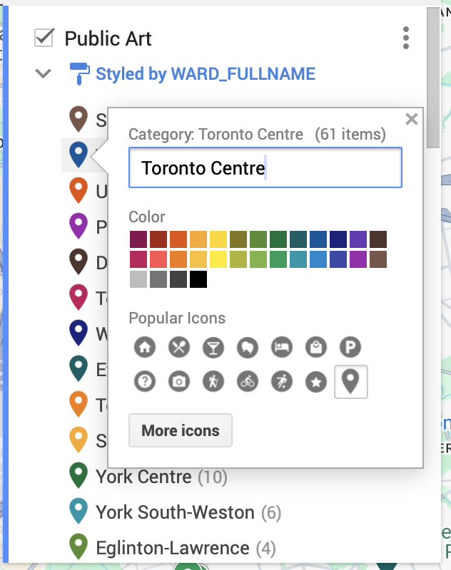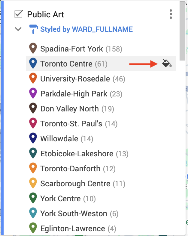 Right now, the drop-pins representing Public Art are uniformly styled. This means that each icon is same color, size, shape, etc. You can change the styling by grouping places/datapoints in the following ways: