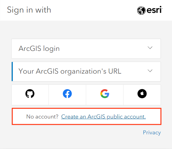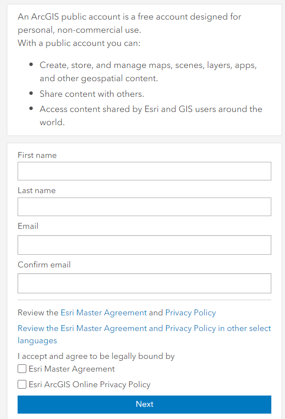 An ArcGIS free account can be created by anyone and is intended for noncommercial, nongovernmental use. When using ArcGIS StoryMaps with a public account, some advanced storytelling and customization features are not available, including: