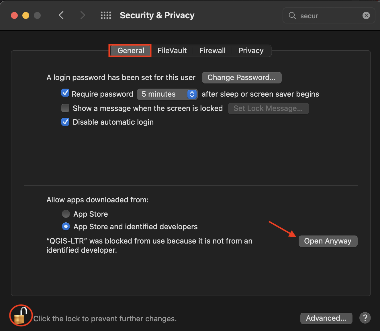 If you’re working on a MacOS and get the message: “QGIS-LTR can’t be opened because Apple cannot check it for malicious software” when you try to open the application, go to System Preferences –> Security & Privacy –> General and unlock your settings. At the bottom of the dialogue box you will see an option to Open Anyway. Click that, then re-lock your settings and try again to open the QGIS-LTR application.