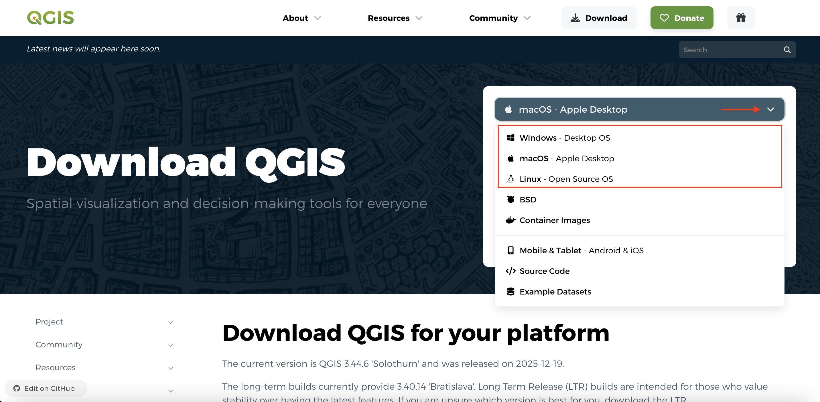 Install QGIS for your operating system. From qgis.org’s Downloads page, select your computer’s operating system from the drop-down menu.