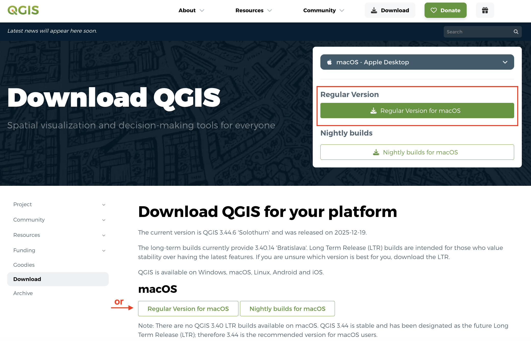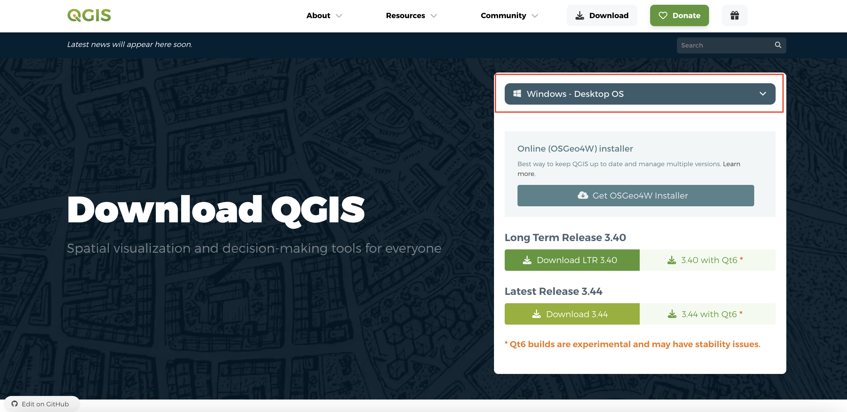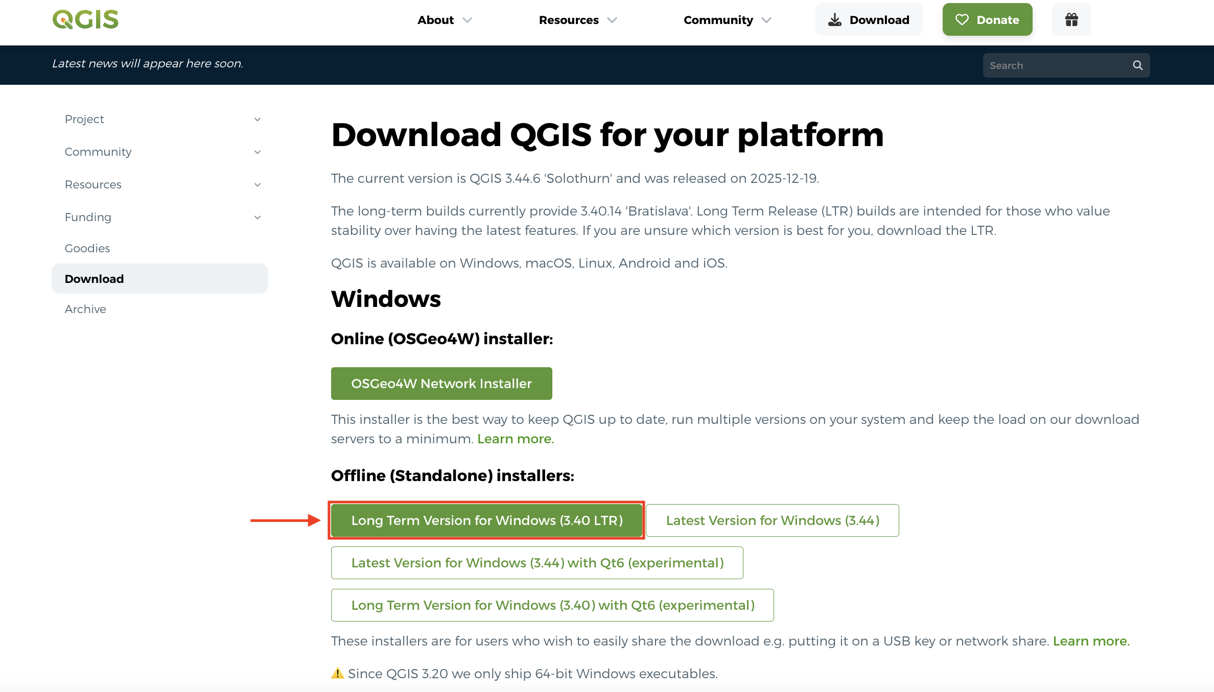 QGIS can be downloaded from qgis.org’s Downloads page. In most cases, you’ll want to download and install the Long term release instead of the latest release. This will give you most of the functionality you’ll need without encountering the software bugs of newly released versions.