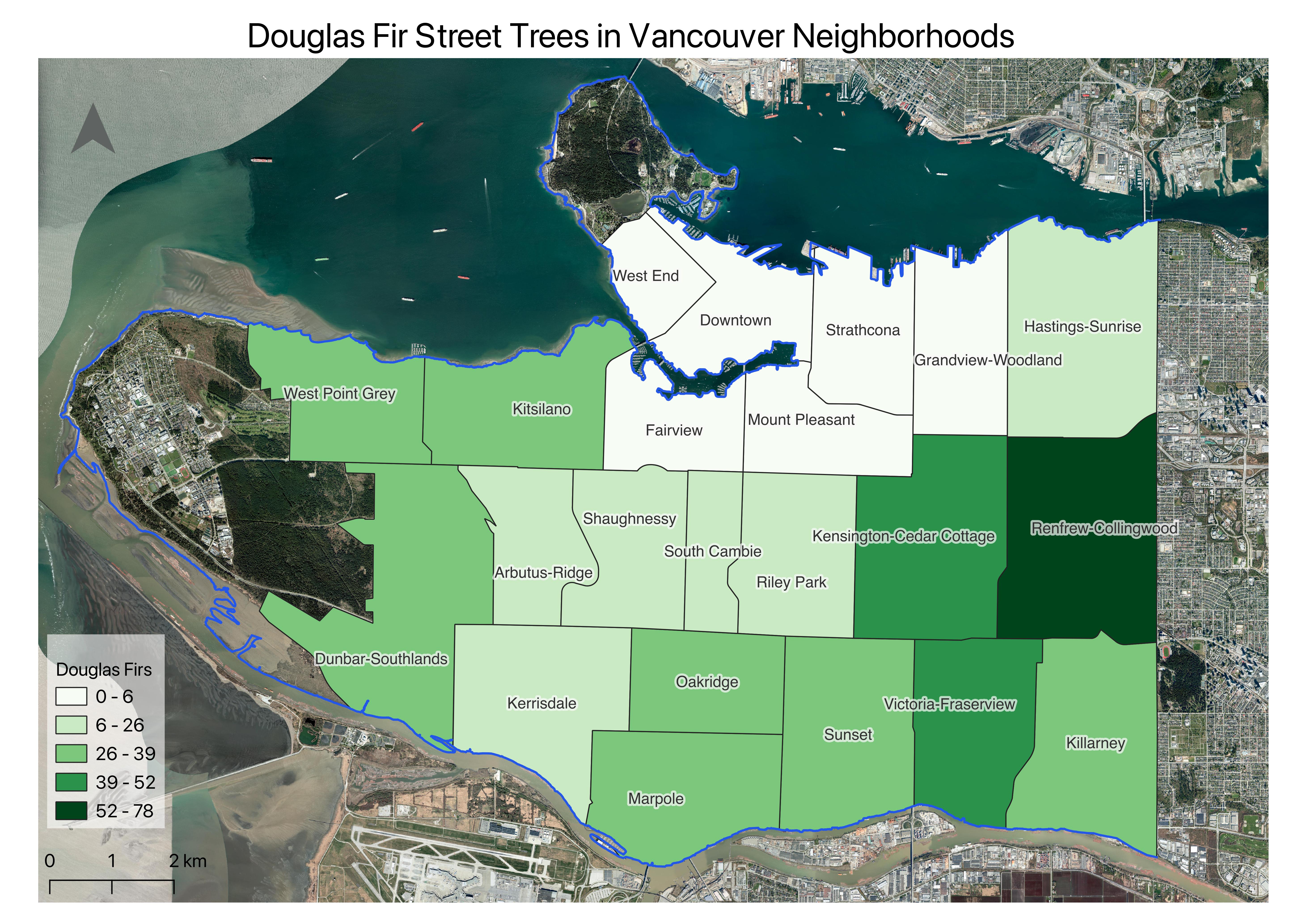 This is an introductory workshop focusing on the fundamental concepts and skills needed to begin using QGIS to explore and analyze spatial data. The result of this project will be a choropleth map showing the number of Douglas Firs lining the streets in each of Vancouver’s neighbourhoods. We will compose and export this map for print. By the end of the workshop participants will be able to: