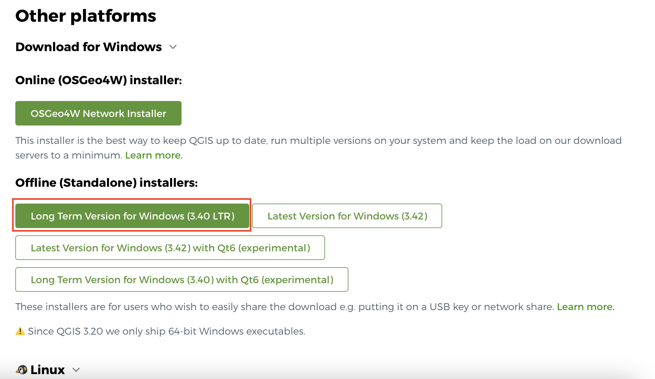 QGIS can be downloaded from qgis.org’s Downloads page. In most cases, you’ll want to download and install the Long term release instead of the latest release. This will give you most of the functionality you’ll need without encountering the software bugs of newly released versions.
