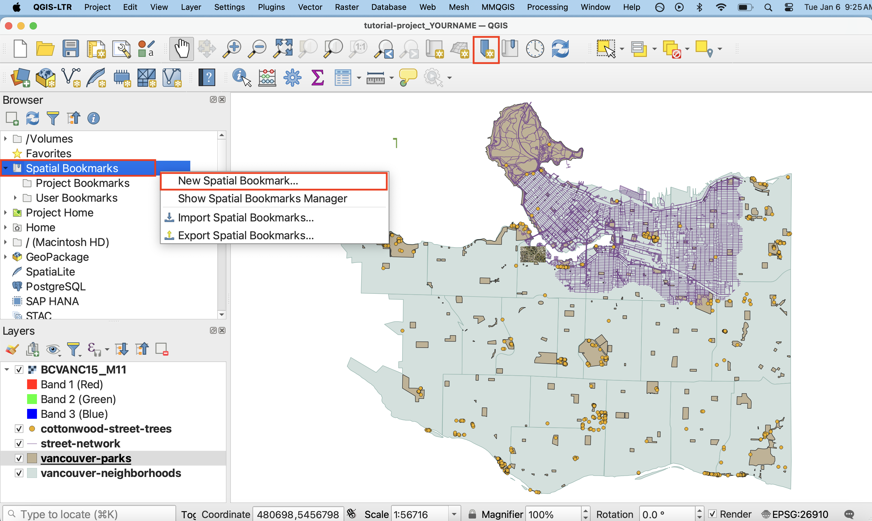 Make a spatial bookmark of the aerial photo. If you’ve already zoomed to the provinces layer, set your spatial bookmark extent to “Map Canvas Extent”. Otherwise, be sure BCVANC15_M11 is centered on your screen first, or set the that layer as your extent. Save to Project Bookmarks.