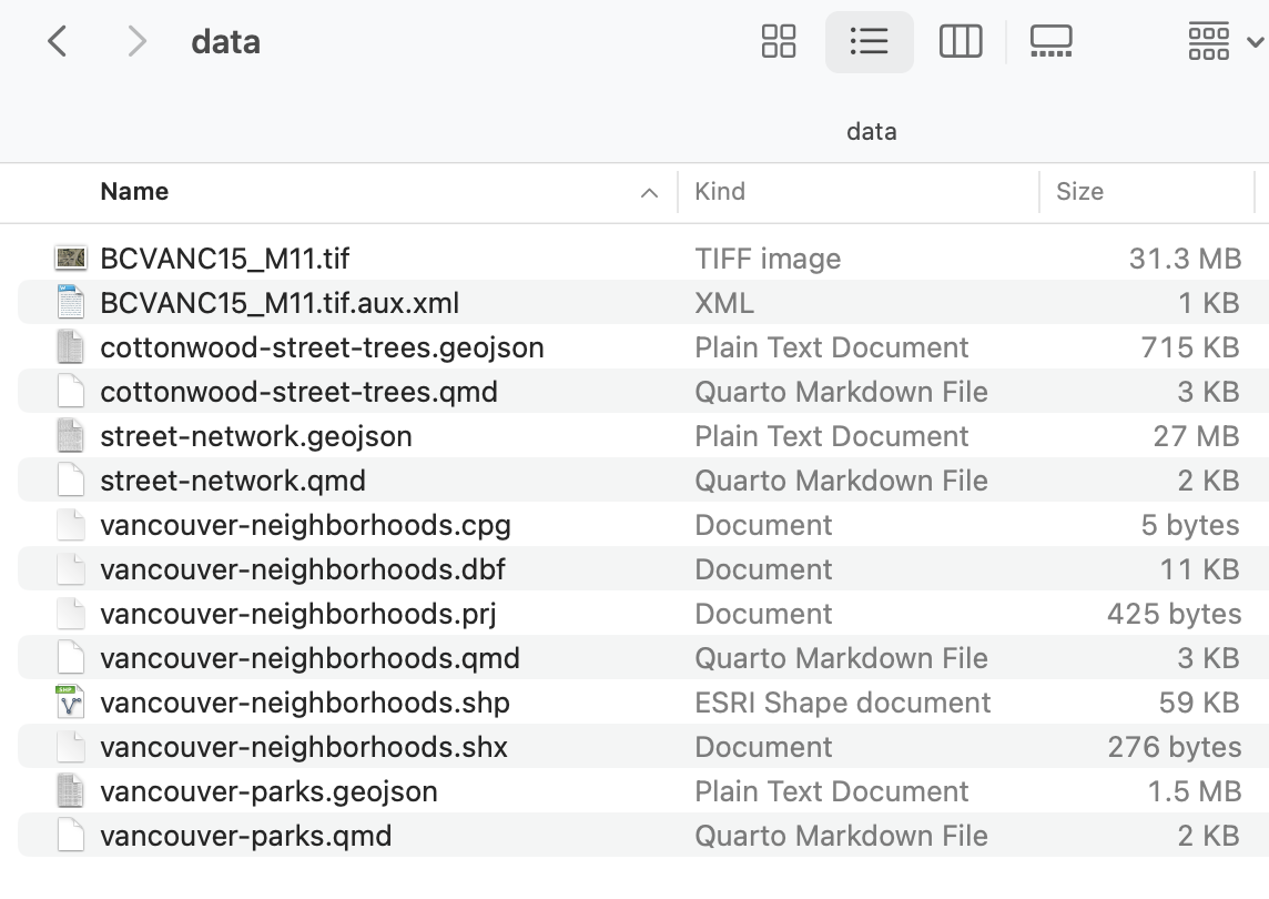 cottonwood-street-trees.geojsonis a geoJSON of cottonwood street trees across the city. This is vector data comprised of points. You’ll notice it has an attendant markdown file,cottonwood-street-trees.qmd. Again, you can ignore that for now—it just contains metadata—but be sure it stays with the geoJSON file. If you look at it from your computer - you’ll recognize the file extensions - vector - shapefile and geojson and a tiff - sattelite imagery. -