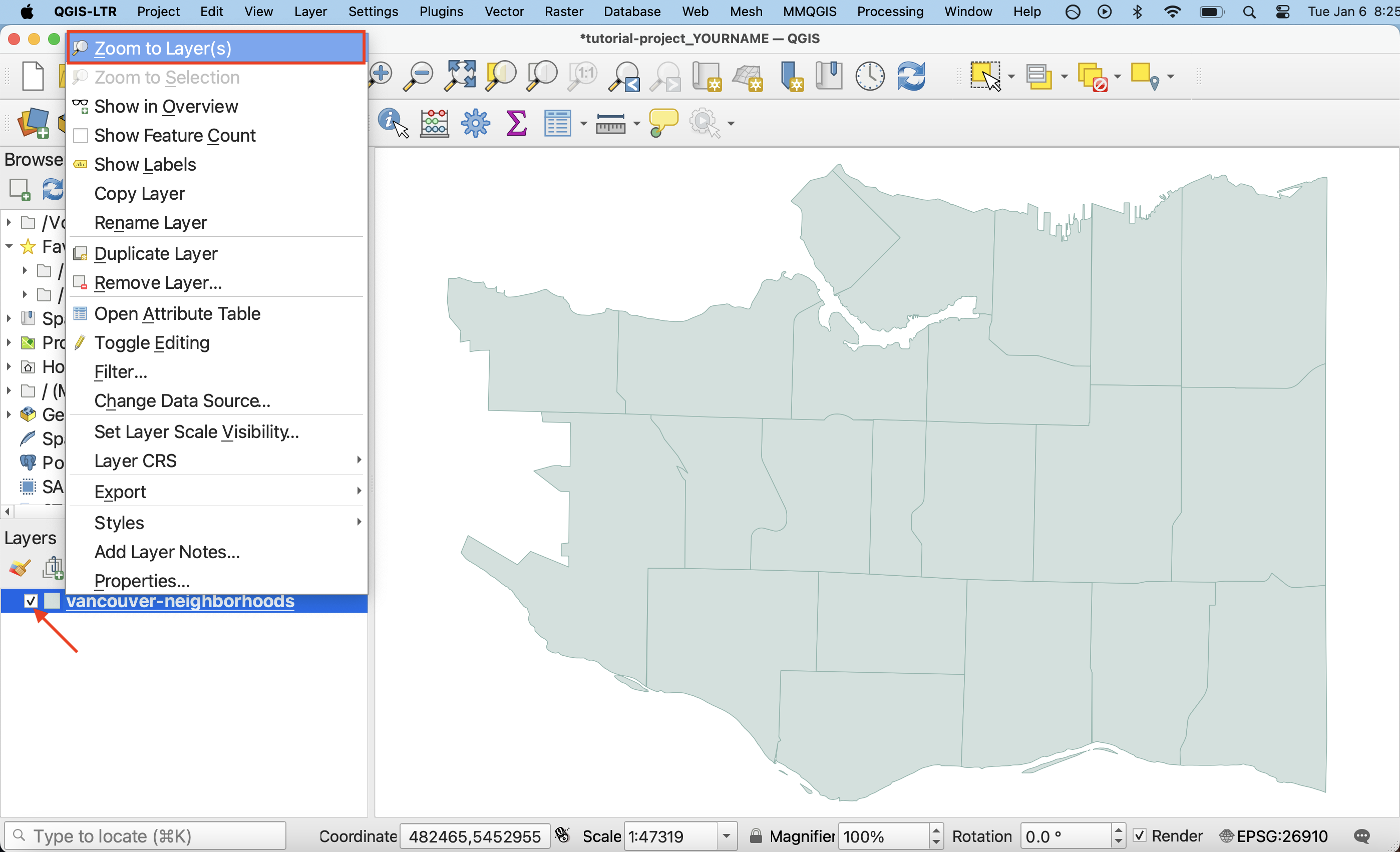 Notice there is a layer in the Layers Panel called vancouver-neighborhoods. It’s visibility is currently turned off. Click the box next to it to turn it on. If nothing shows up on your Map Canvas, right-click (control click) the layer and choose “Zoom to Layer(s)” from the top of the pop-up menu. Your screen should now look like the image below.