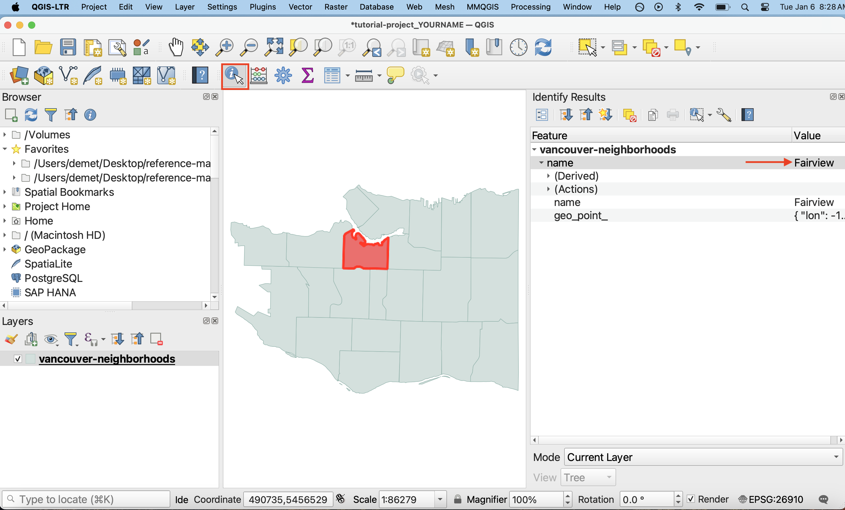Use the Identify tool to look up the names of different neighborhoods. To use the Identify tool, click the tool icon in the Toolbar, then click on any neighborhood polygon.