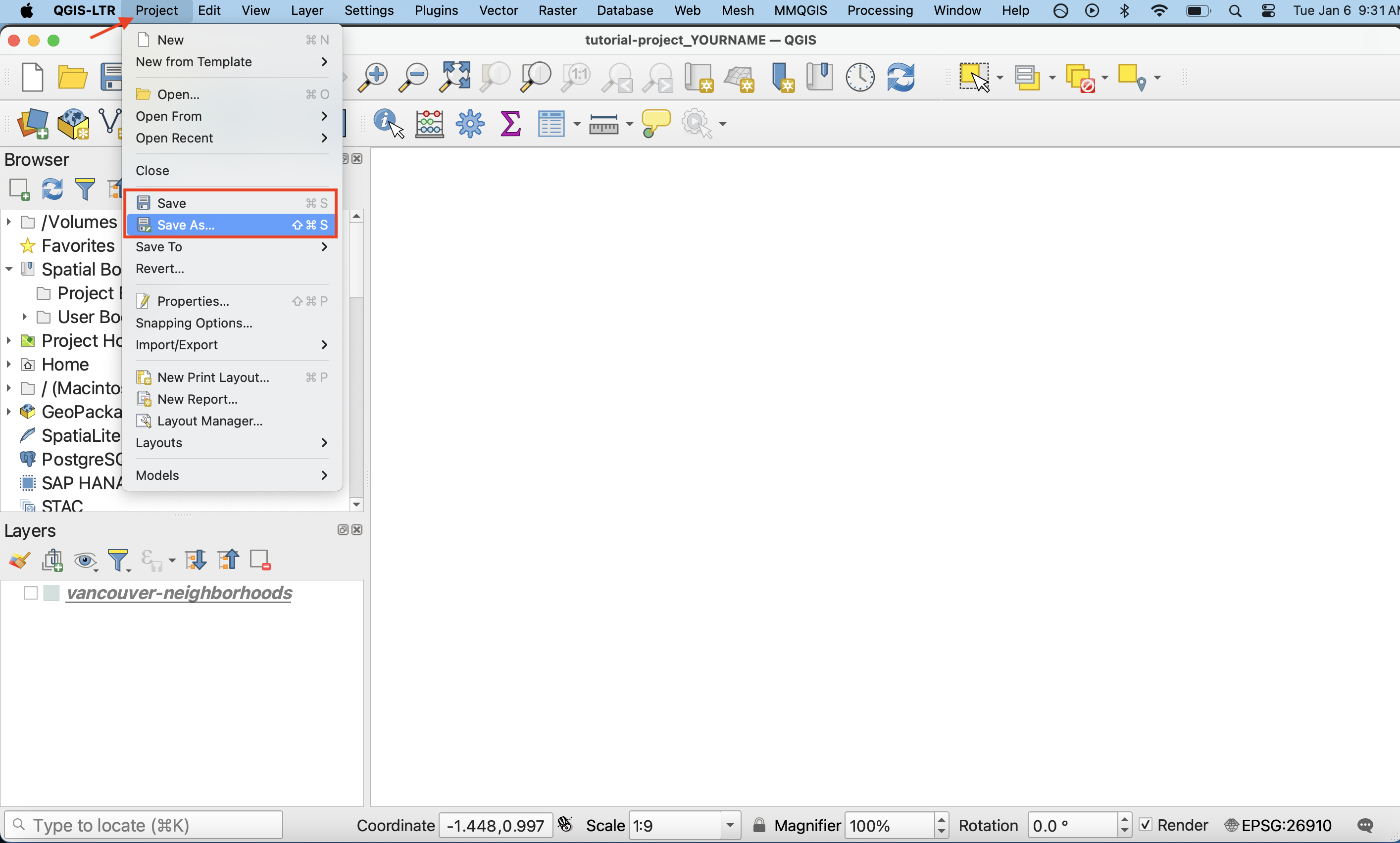 To save your project, navigate to the Project Menu at the stop of your screen and go down to “Save As”. Save the project to a location on your physical computer (such as Desktop or Downloads) and give it a name such as tutorial-project_FirstnameLastname. It’s best practice to save your QGIS projects to the folder where you keep your data for the project. Once you save your project to your computer, you’ll notice the file extension is .qgz. Learn more about QGIS file formats here.