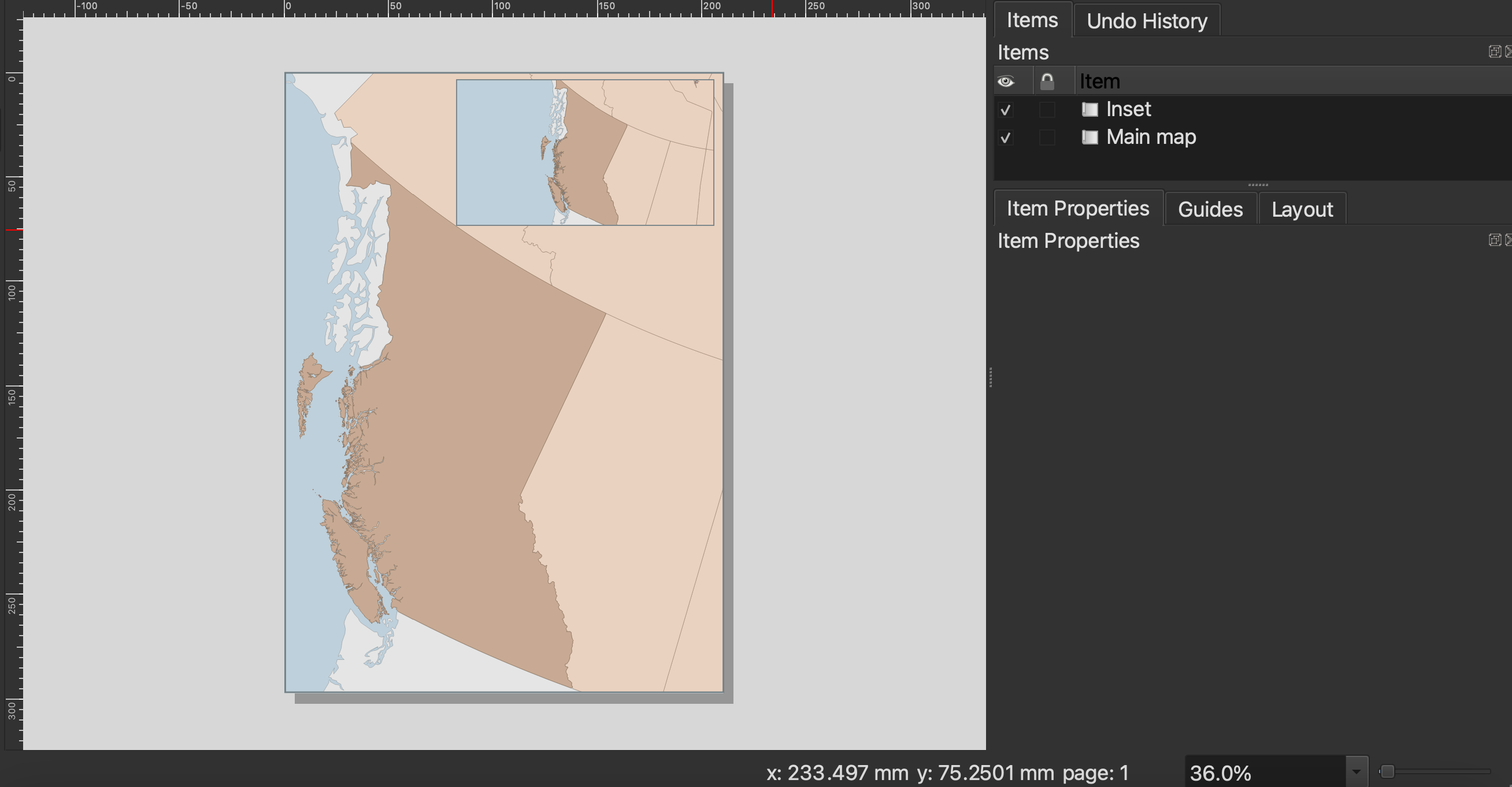 Use the Move item content tool to drag BC to the left of your map, creating a spot for an inset on the upper right-hand corner. Before working any further, go ahead and Save your Print Layout.