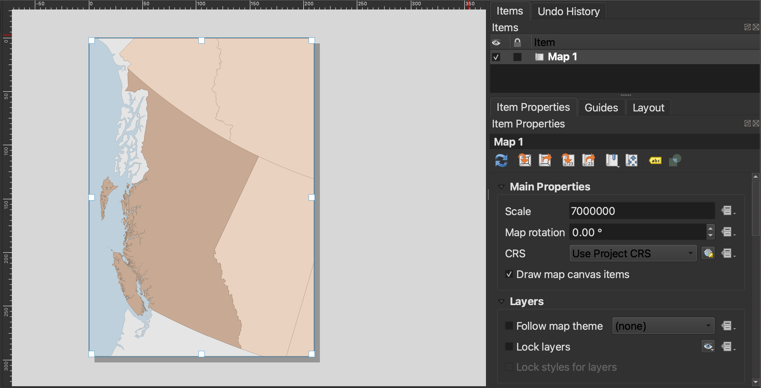 Create a new Print Layout and call it BC-map. Add your current map to the layout. For this map, Portrait is the best layout orientation. Adjust the scale as needed to something lke 7000000.