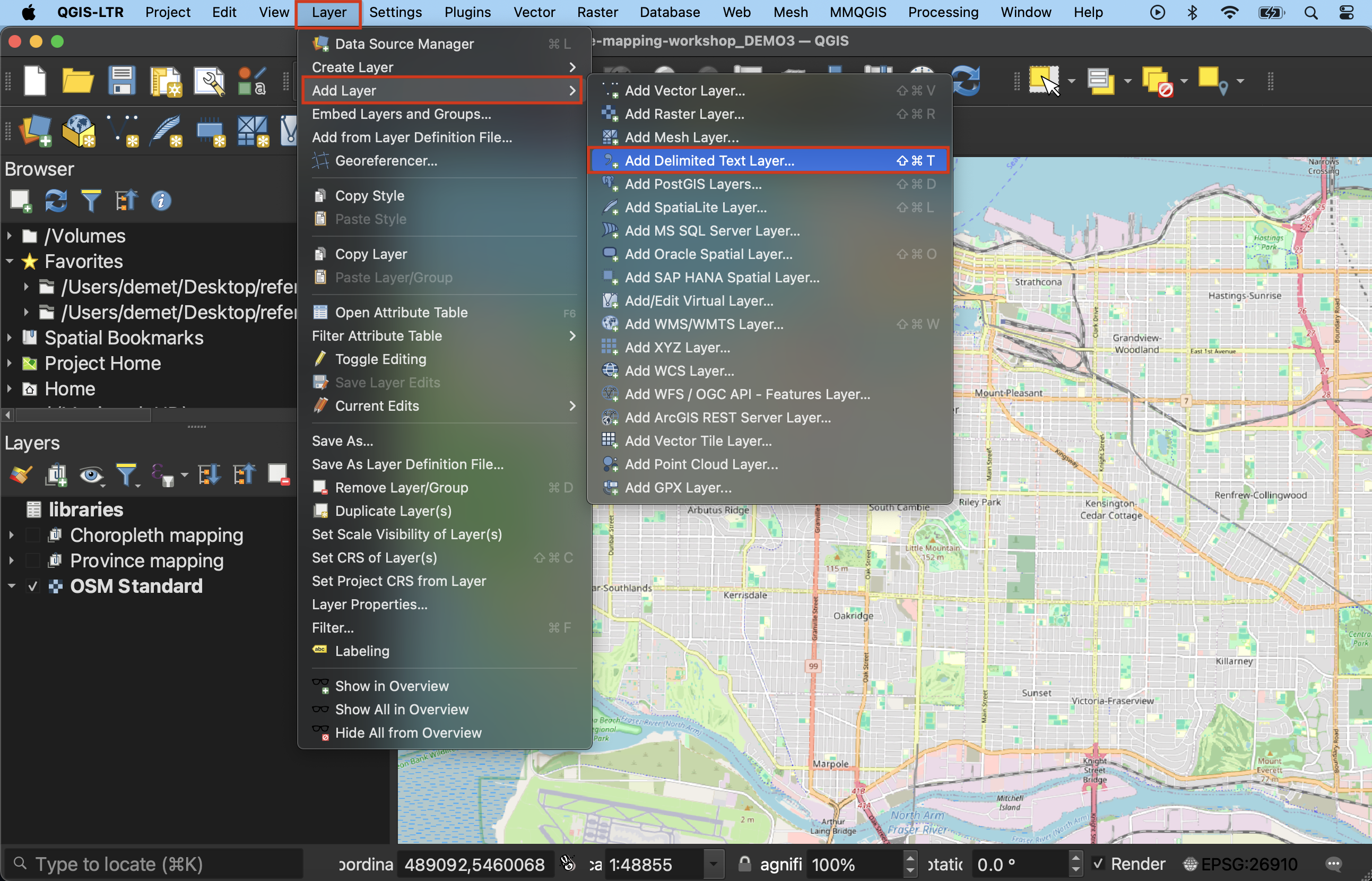 libraries.csvwhich can be found in the thematic-mapping subfolder of the reference mapping workshop data folder downloadable above. If you’re working in a QGIS project that already has data, it can be helpful to hide any irrelevant layers, add a basemap, and set the project projection to something best suited for the area of your CSV data. If usinglibraries.csv, set the project projection toNAD83 / UTM zone 10N. -