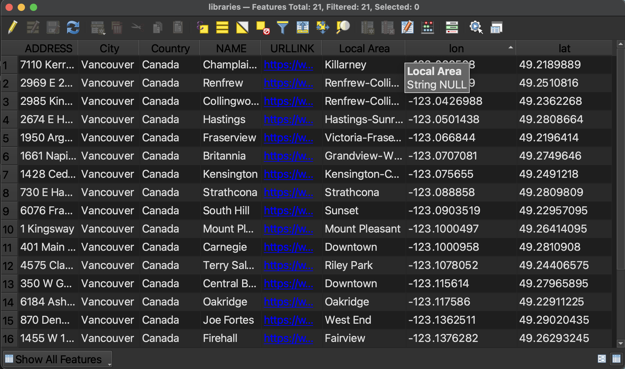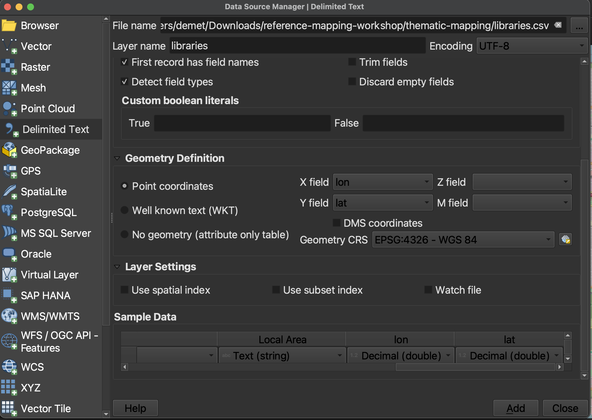 Now click Add at the bottom right-hand corner to add your CSV as a spatial layer to your map. Once you add the layer, the Data Source Manager will not go away, so you’ll have to close it. Libraries should now be added to your map canvas.