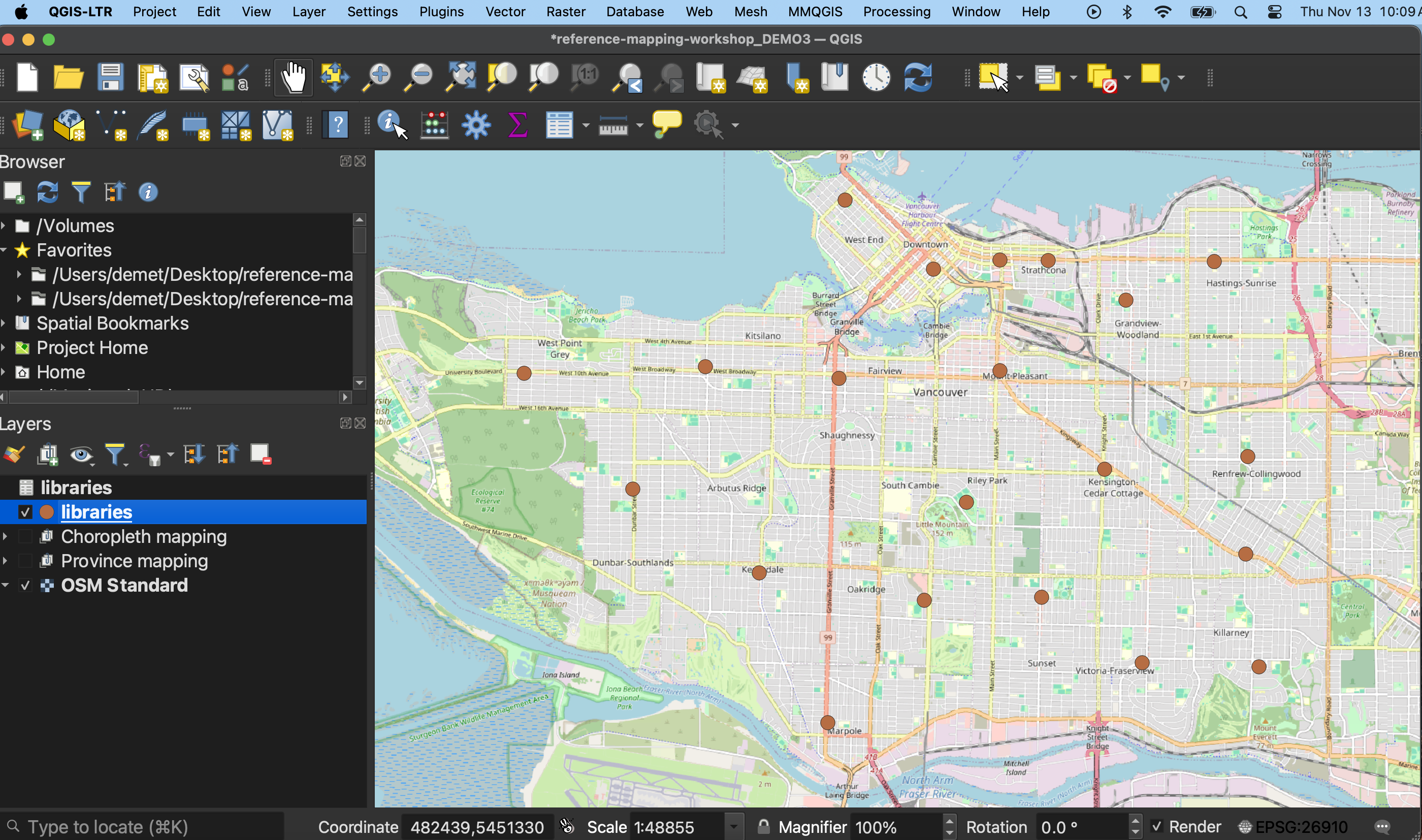 librarieslayer in your Layers Panel, you will see it’s still stored aslibraries.csv. To save this spatial layer, right-click and export it to your data folder in a spatial file format such as shapefile or geojson.
