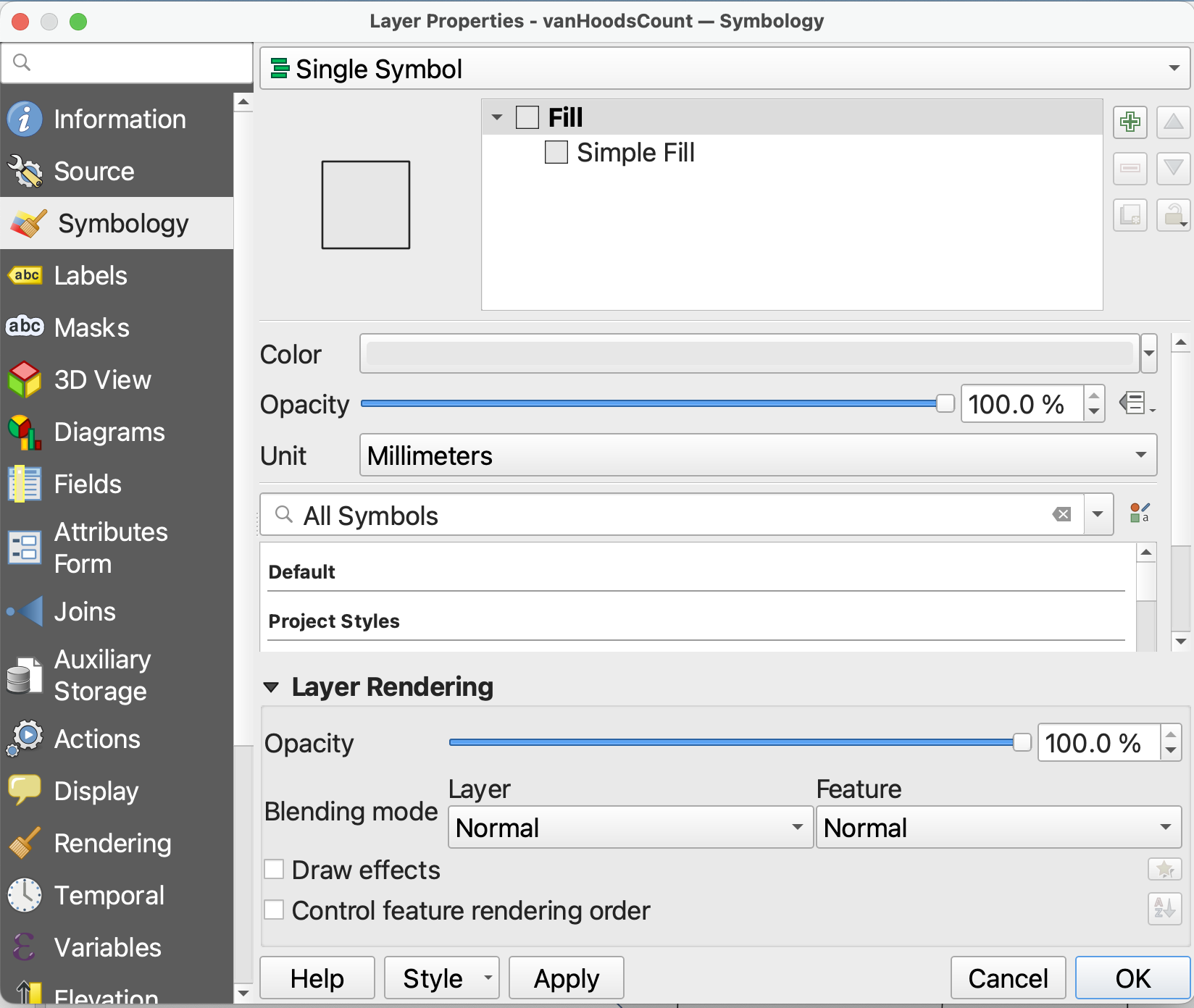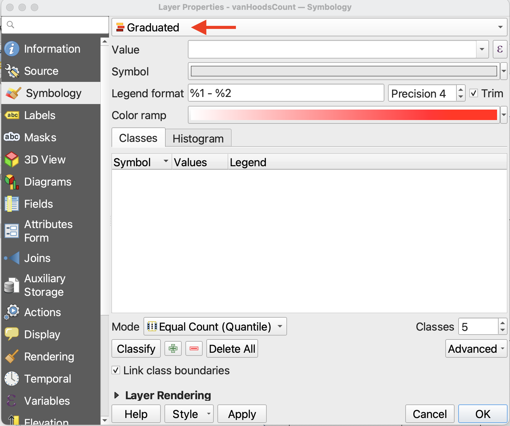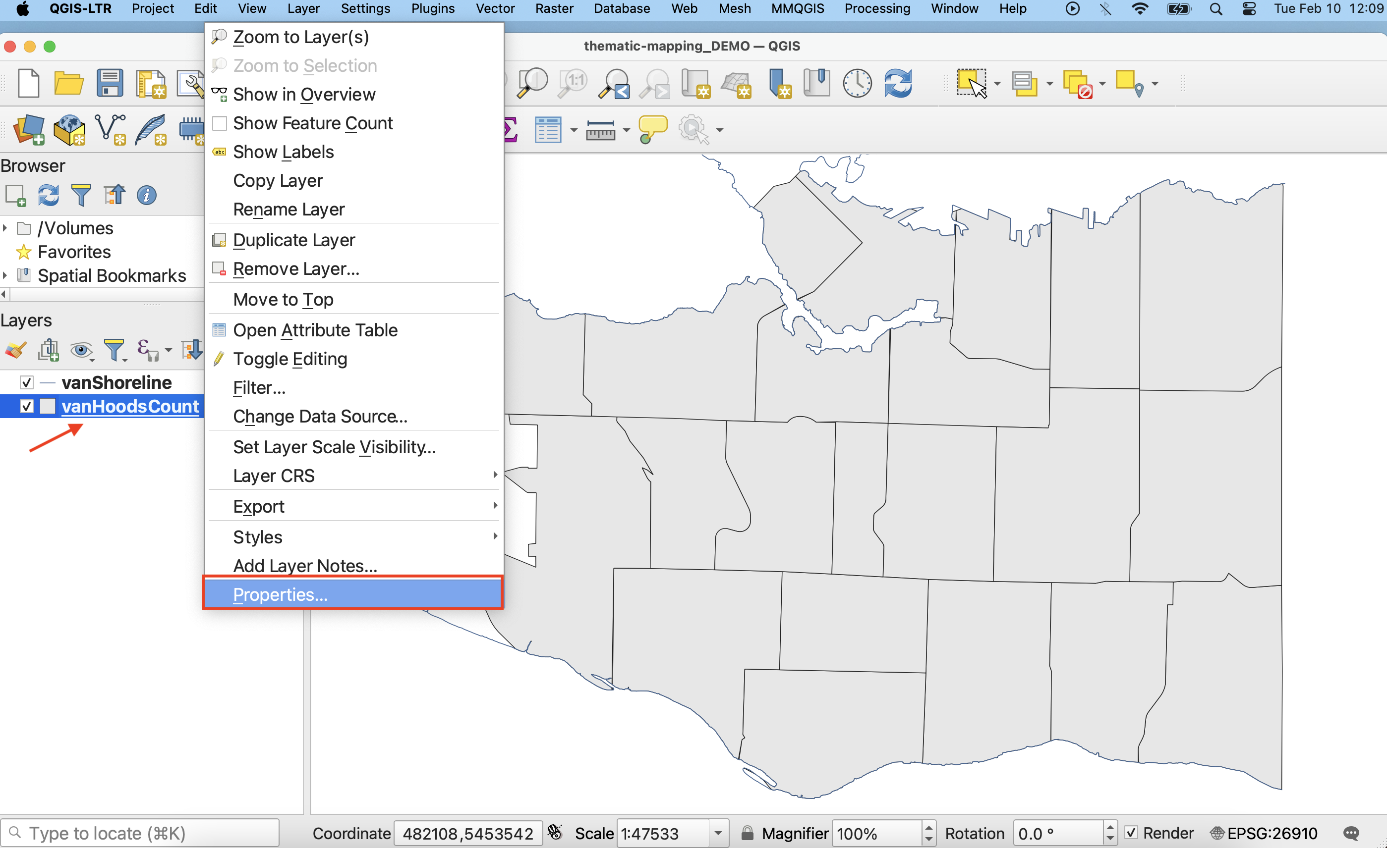1 In the Layers Panel, right-click on vanHoodsCount and go to Properties. Then, in the Layer Properties window, navigate to the Symbology tab.