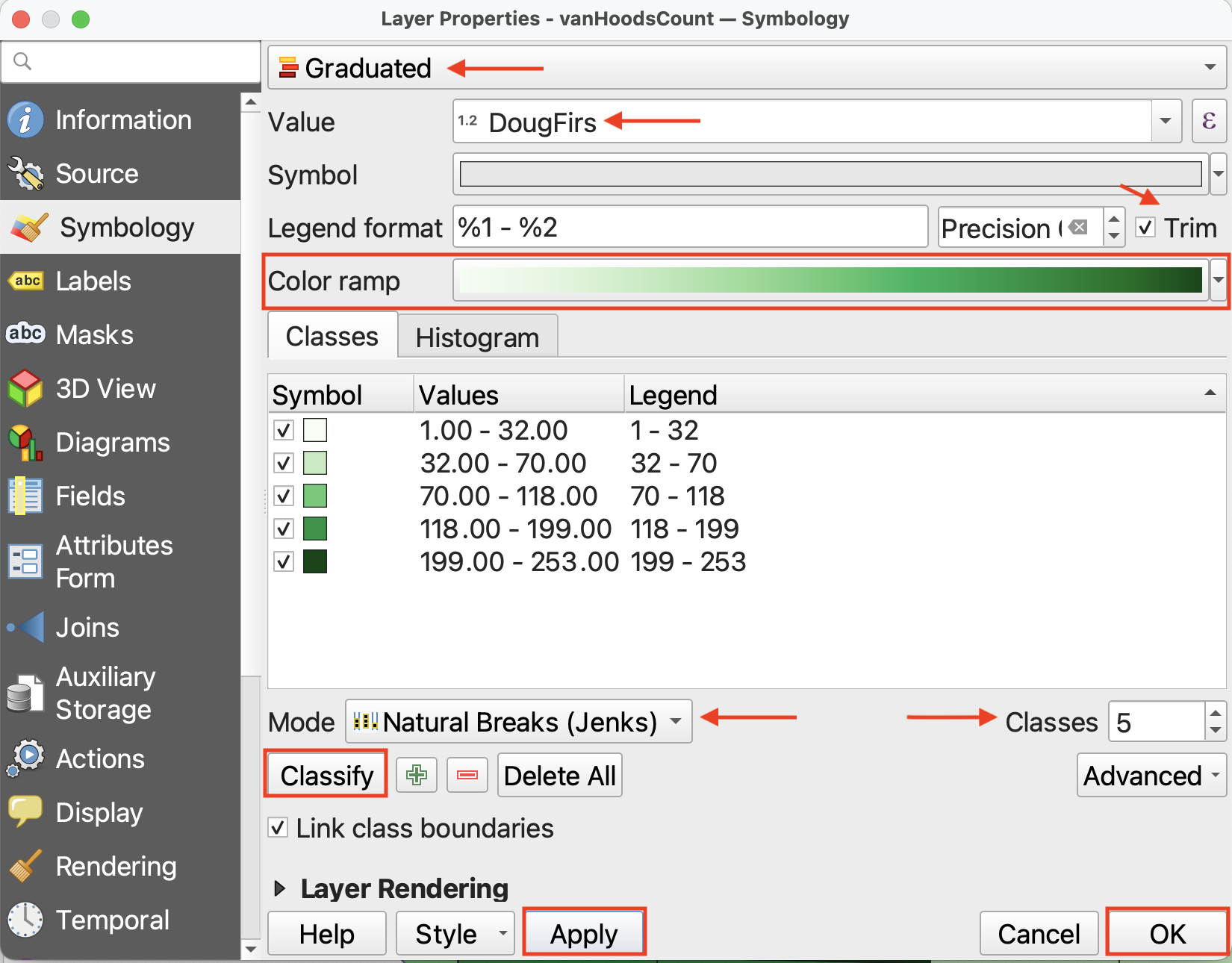 Then, click Apply to see your map change. Only after clicking Classify and then Apply will you see the results.