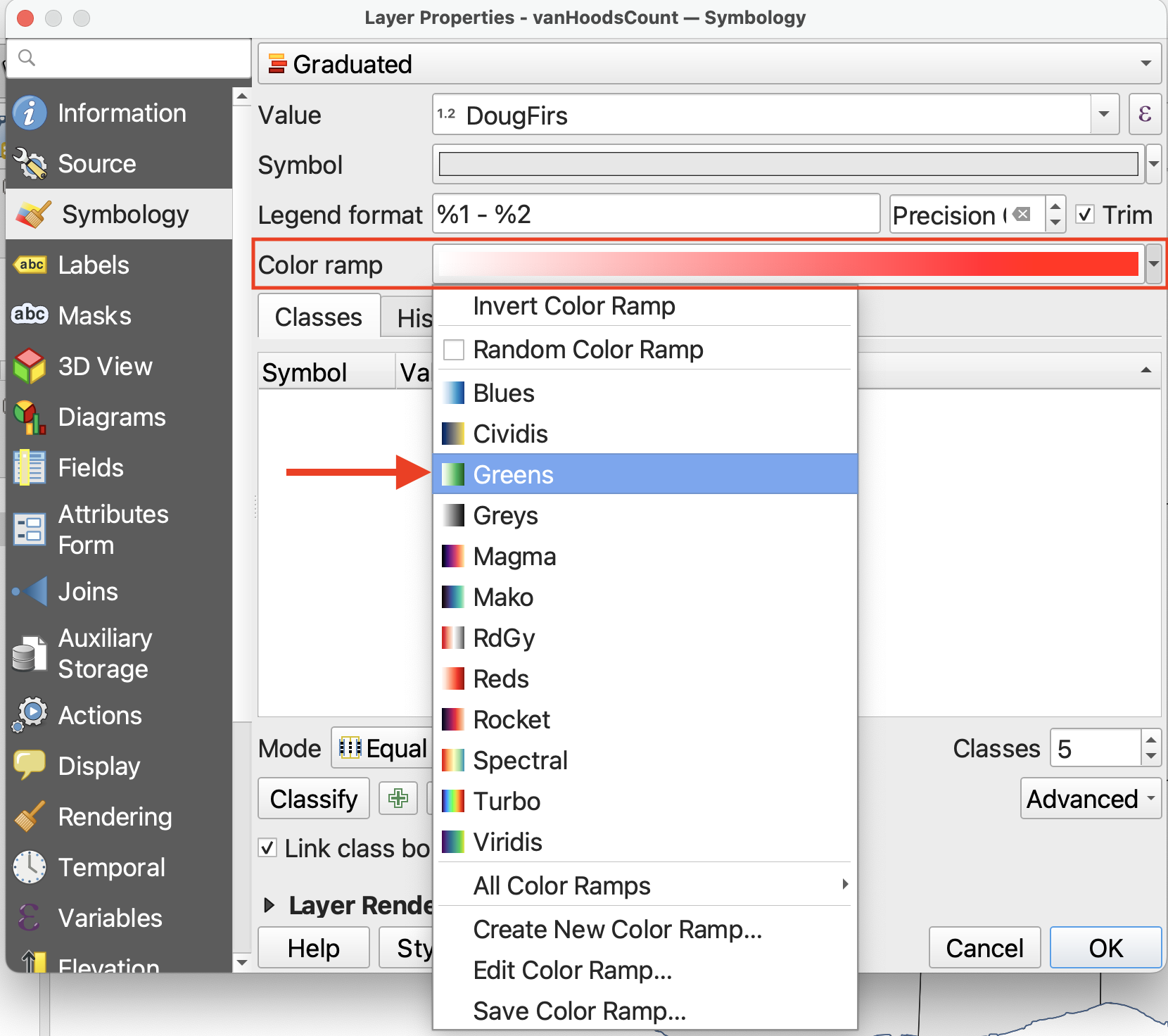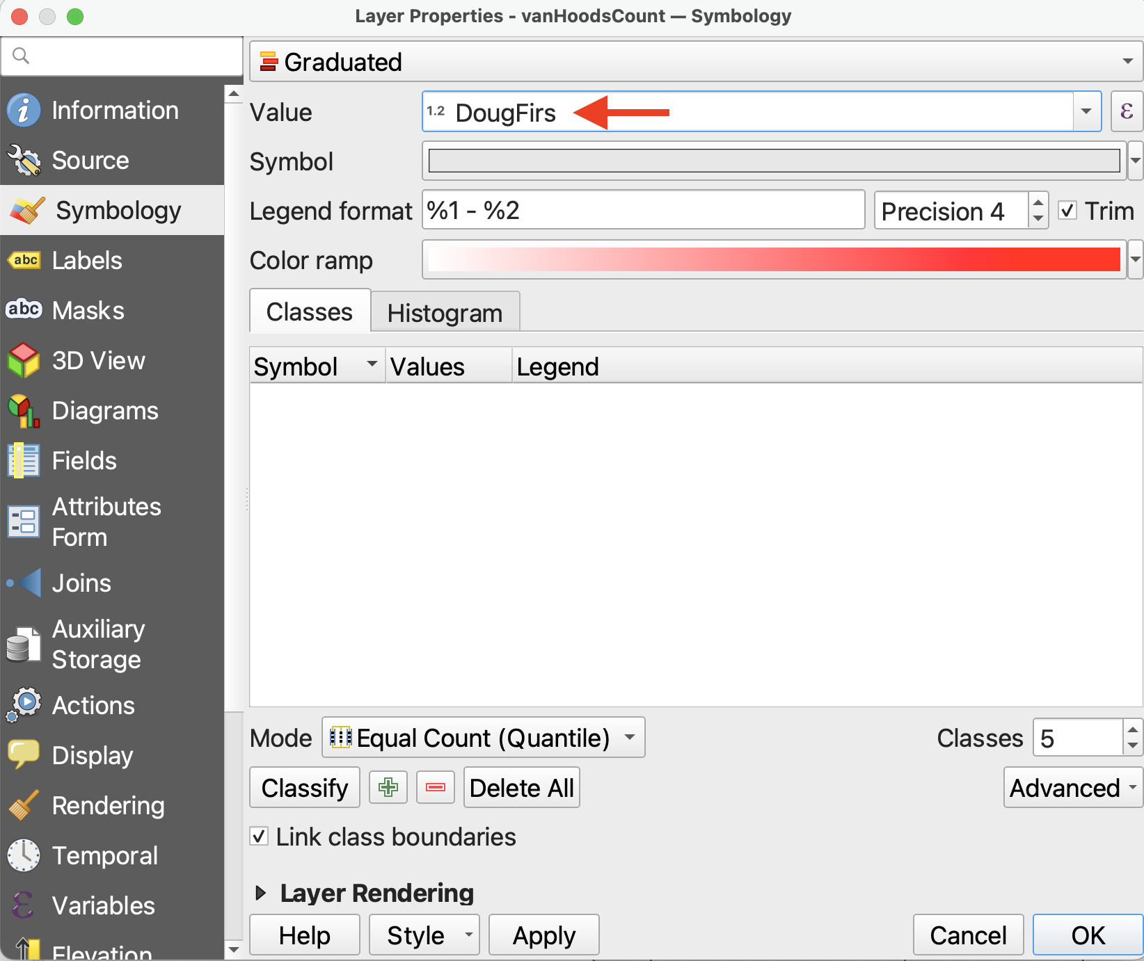 3 Set the Value to DougFirs. (Or Count, if you didn’t specify the attribute back when you ran the Count Points in Polygon tool.) This tells QGIS which numerical field to visualize.