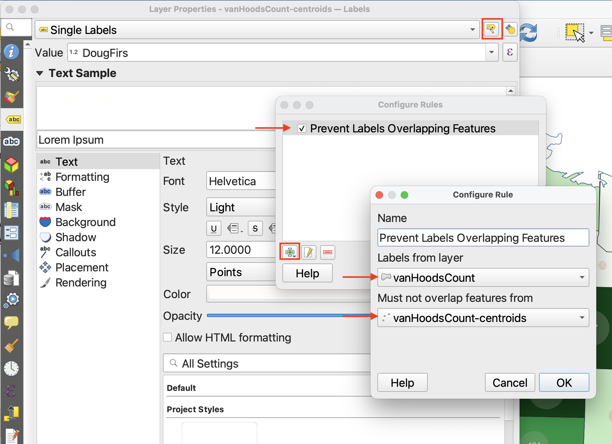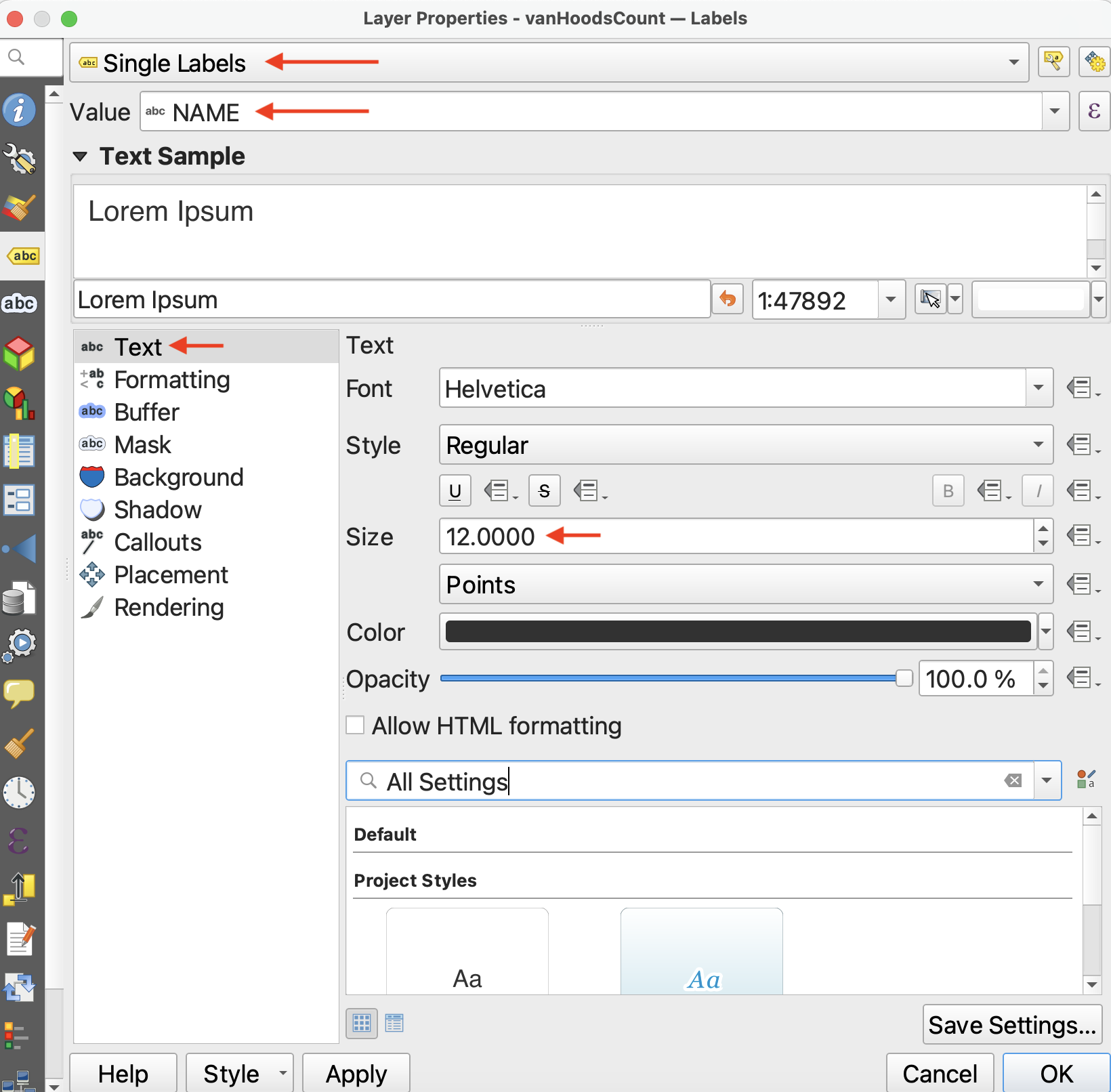 - 2.1 Back in the Layers Properties, increase the font size to at least 12 Points.