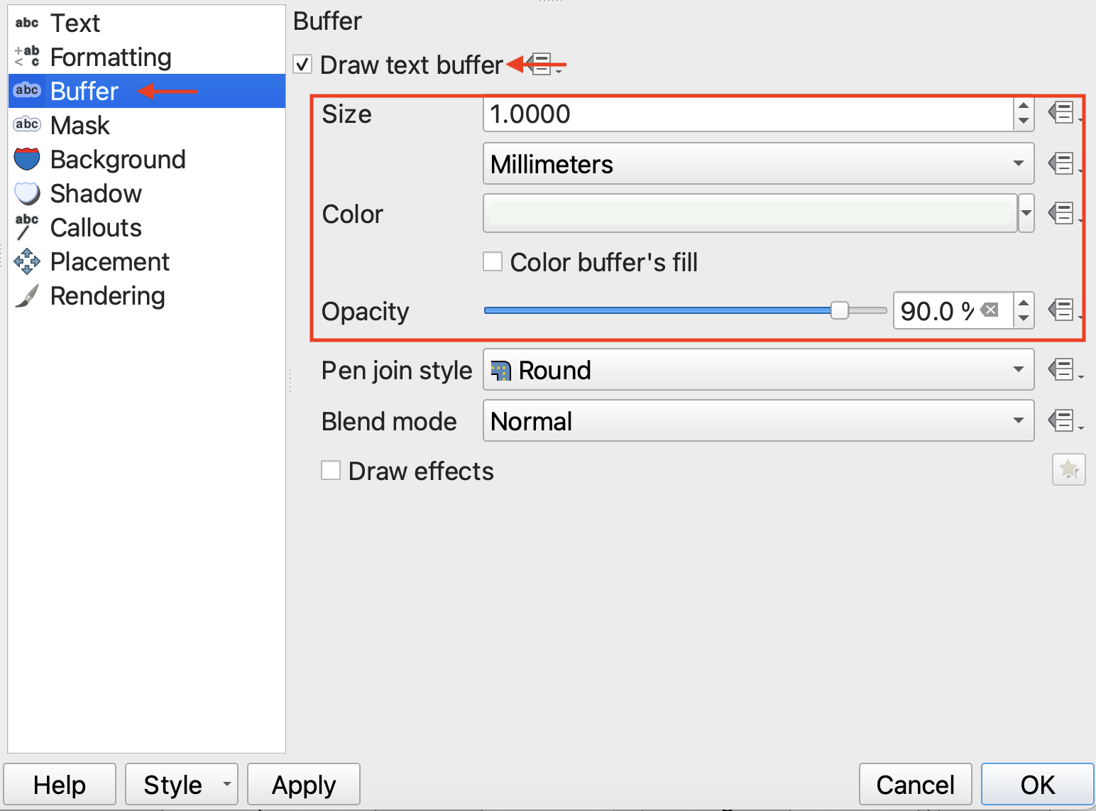 - 2.2 Add a Buffer around the text, something light colored like white but then drop the opacity a bit.