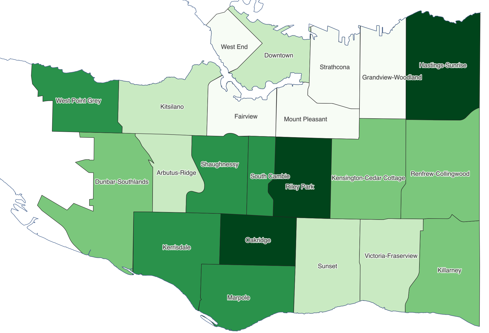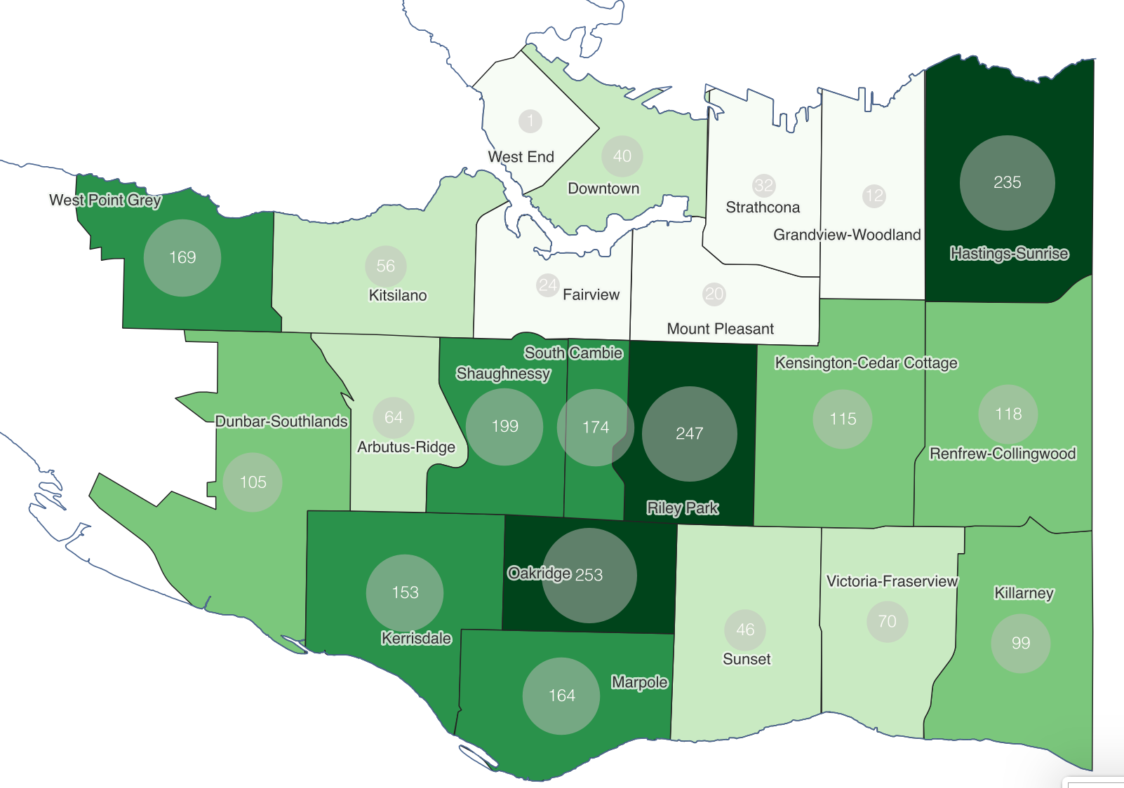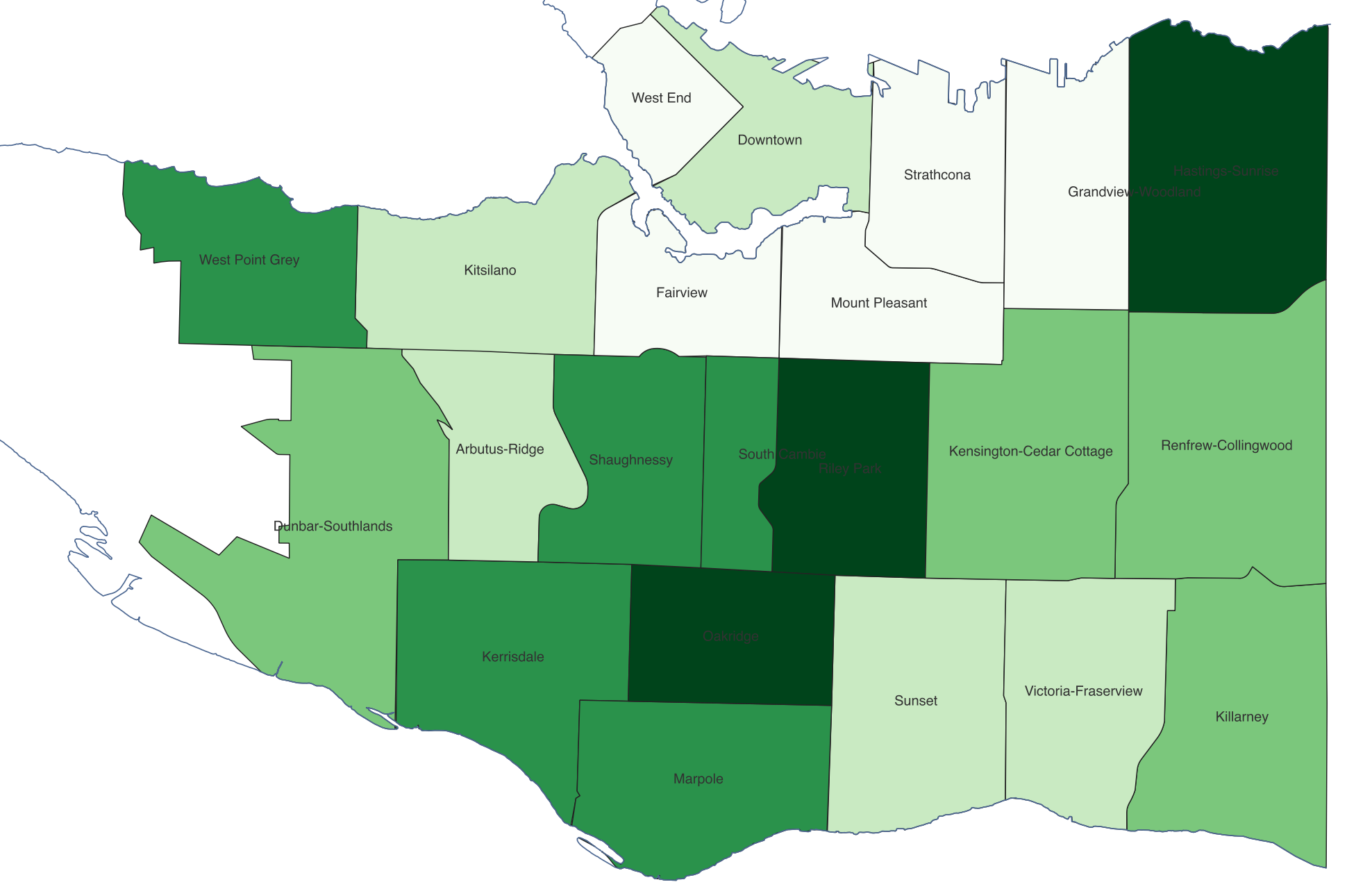 We now have two thematic visualizations of Douglas Fir street trees by Vancouver neighbourhood. However, some contextual information might be useful, such as the names of neighbourhoods and/or the total number of Douglas Firs in each neighbourhood.