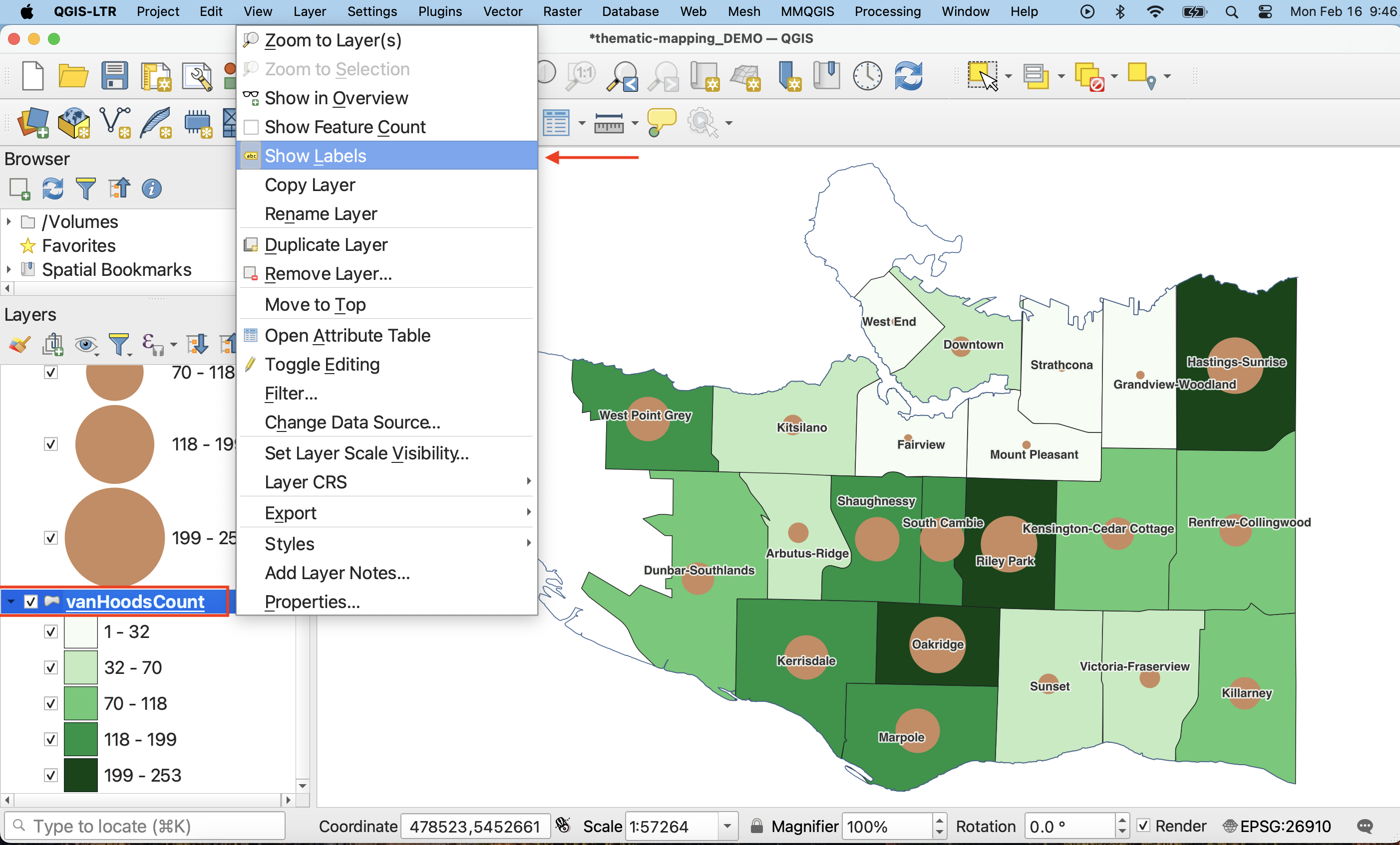 1 Turn the proportional symbol layer back on. You’ll notice the neighbourhood labels obscure some of the symbols. You can Toggle on and off a layer’s labels (without deleting your label settings) by right-clicking the layer, and selecting Show Labels. If labels are on, they will turn off, and vice versa.