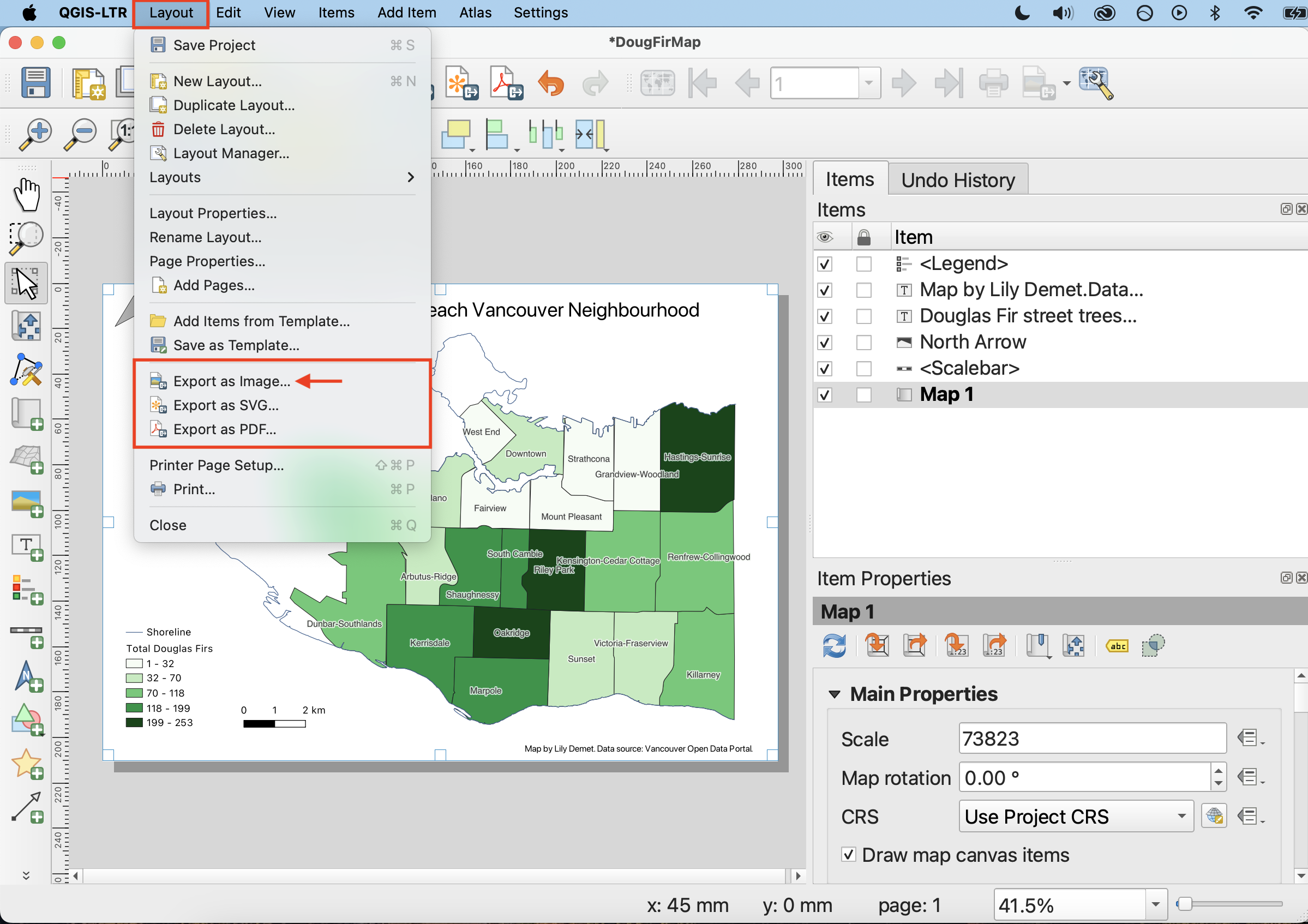 You can export your map as an image, PDF, or scalable vector graphic from the Print Layout toolbar, or from the Layout menu. You can also print your map directly from QGIS.