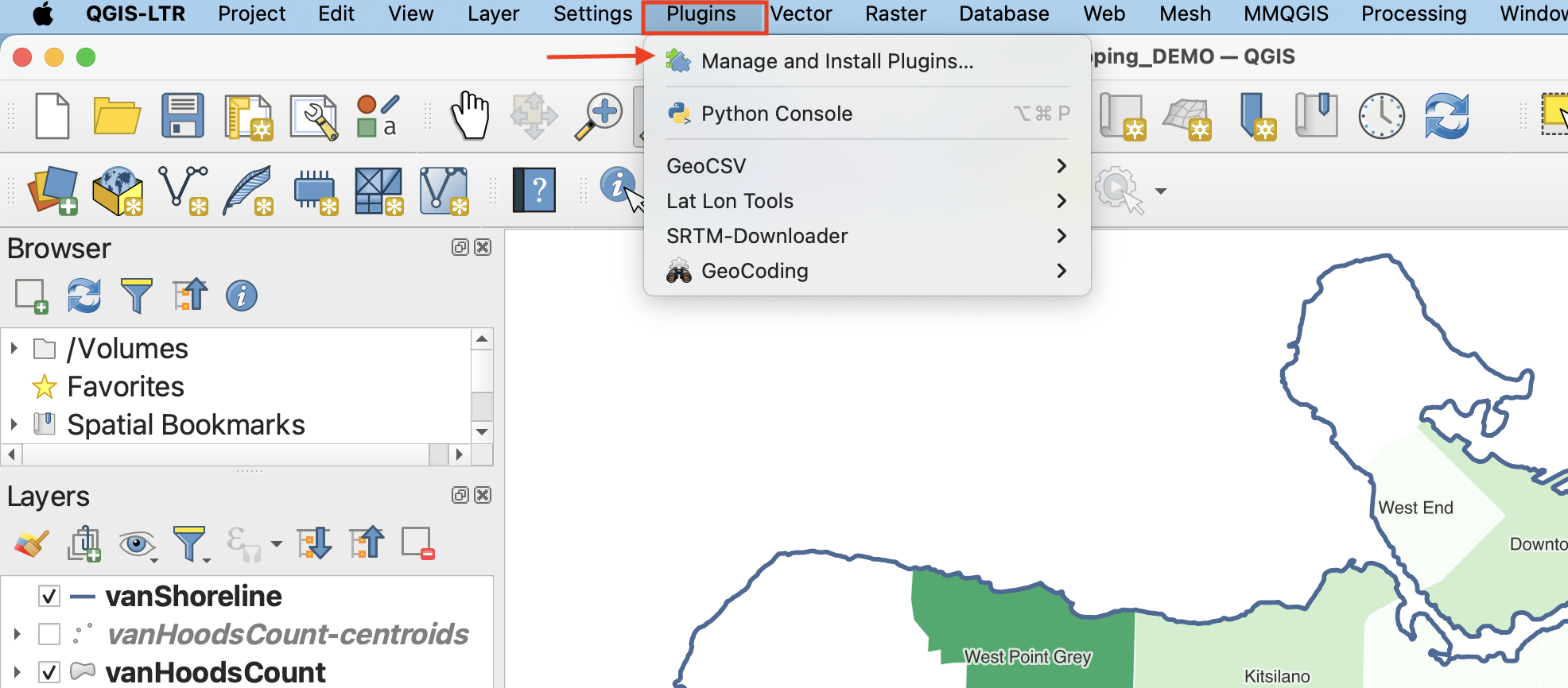 QGIS plugins are user developed tools that extend QGIS functionality beyond the basics. To access basemaps, we’ll first install the QuickMapServices plugin. Click on the Plugin menu at the top of your screen and select Manage and Install Plugins…