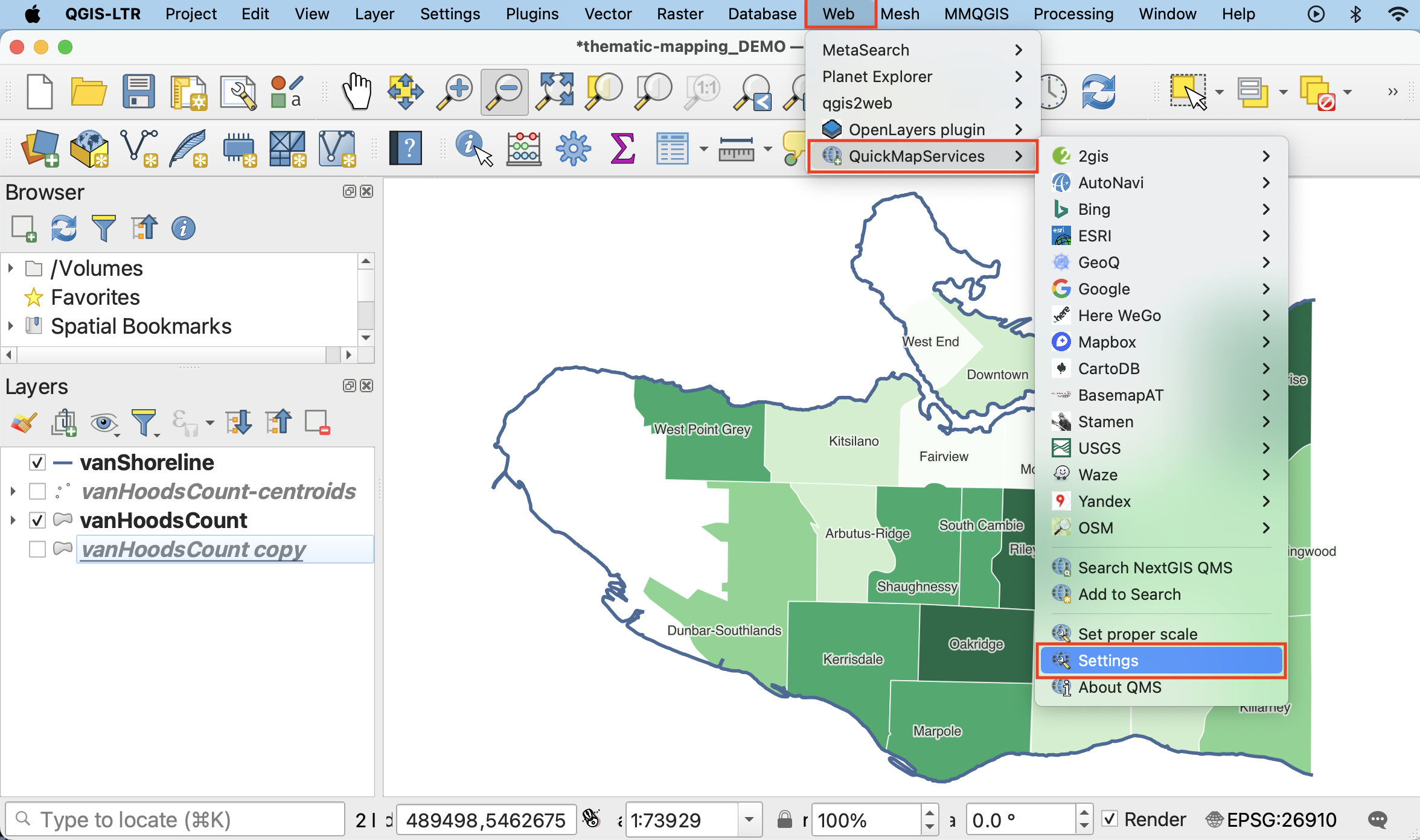 Now go to the Web menu at the top of your screen. You should see the QuickMapServices plugin.