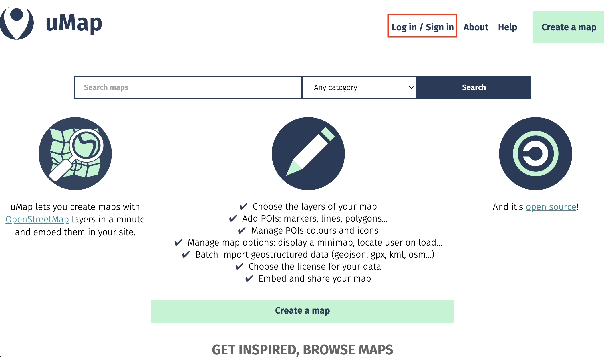 - Go to umap.openstreetmap.fr/en/ and Log in/Sign in. This ensures any map/work you create will be saved so you can return to it later.