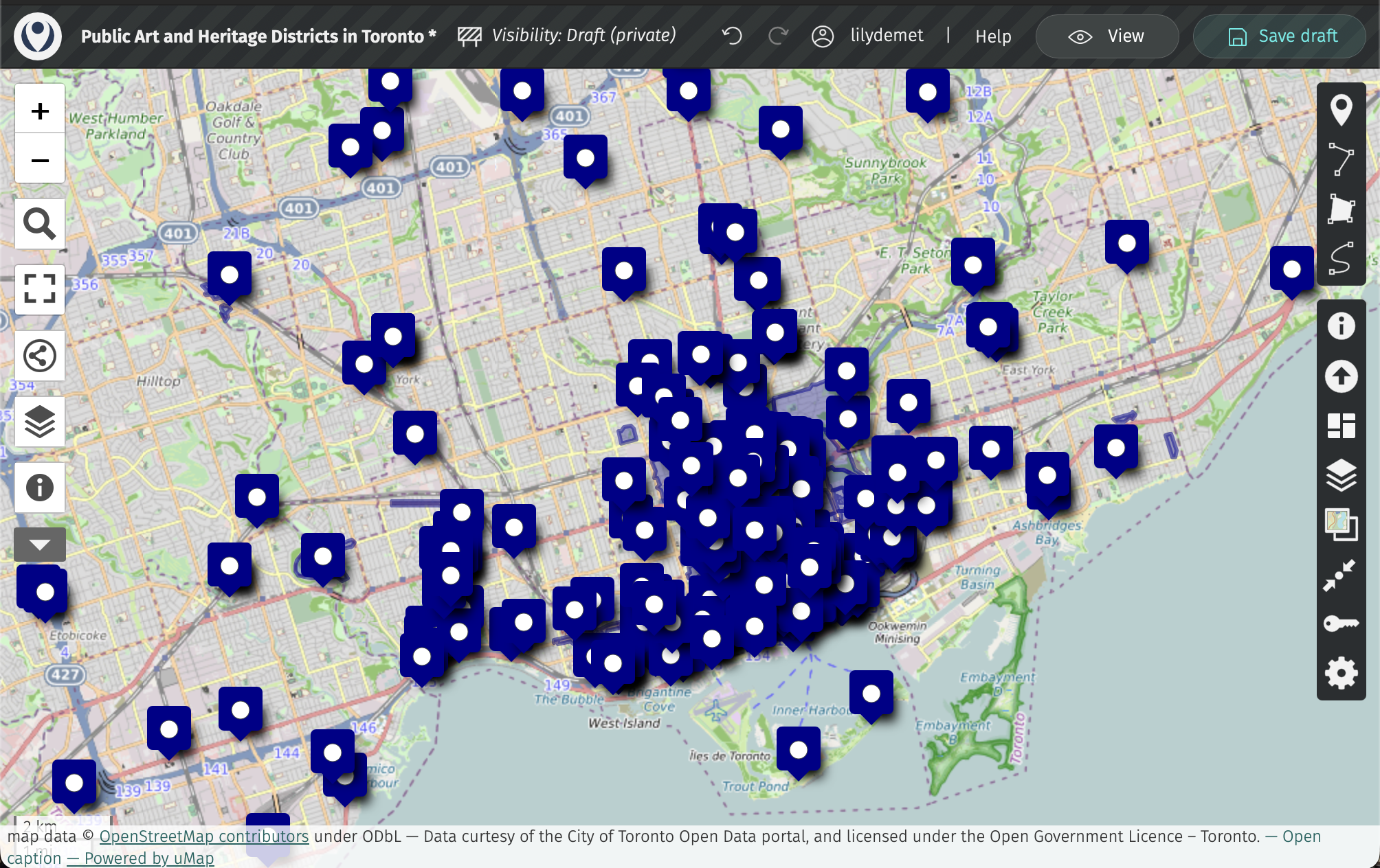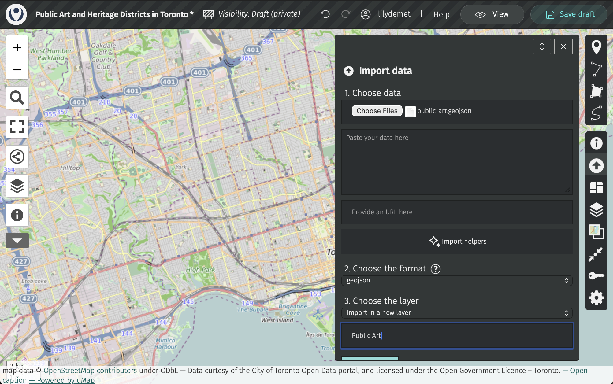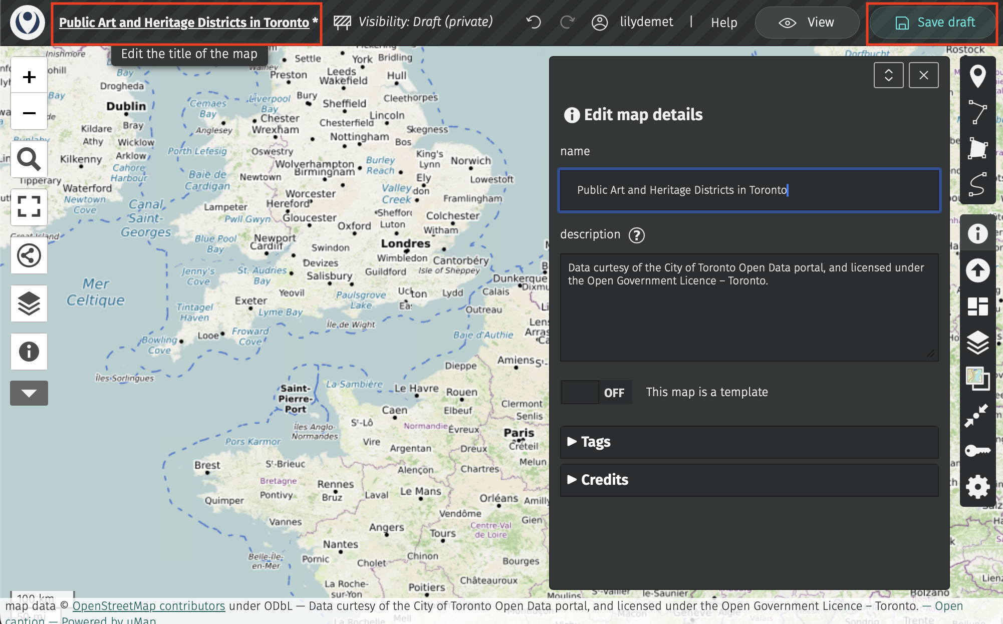 Then, save your draft! uMap does not autosave. Once saved, the little asterisk beside your map title will disappear.