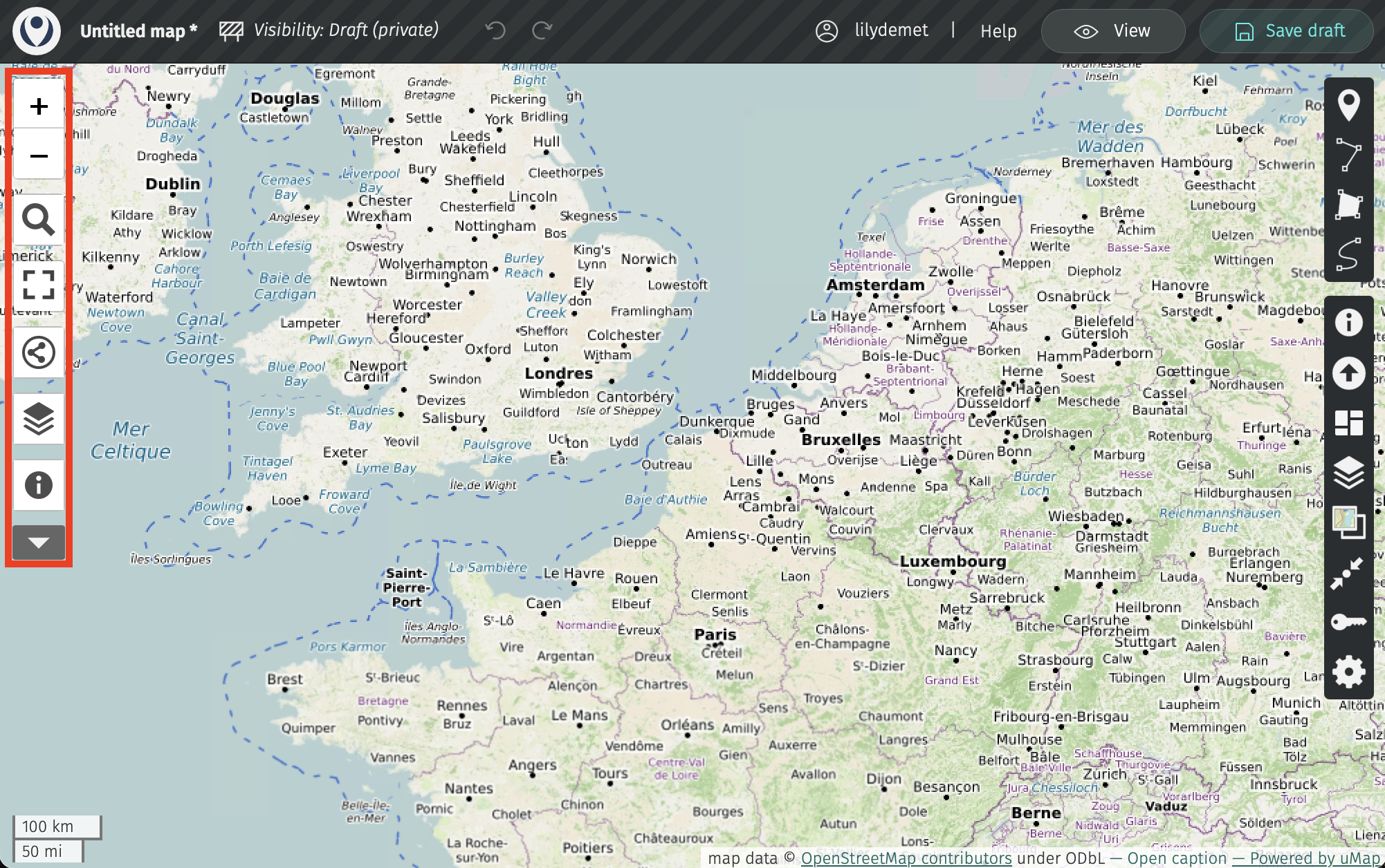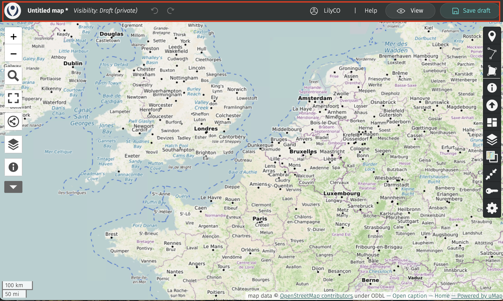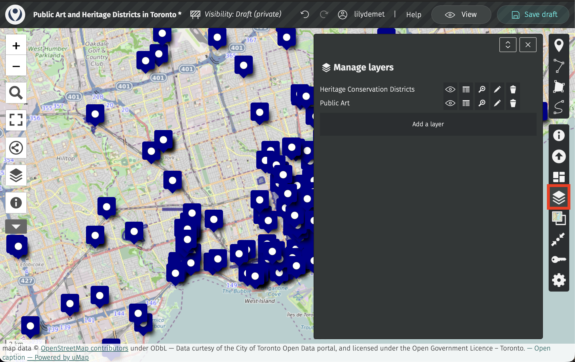 Then, save your draft! uMap does not autosave. Once saved, the little asterisk beside your map title will disappear.