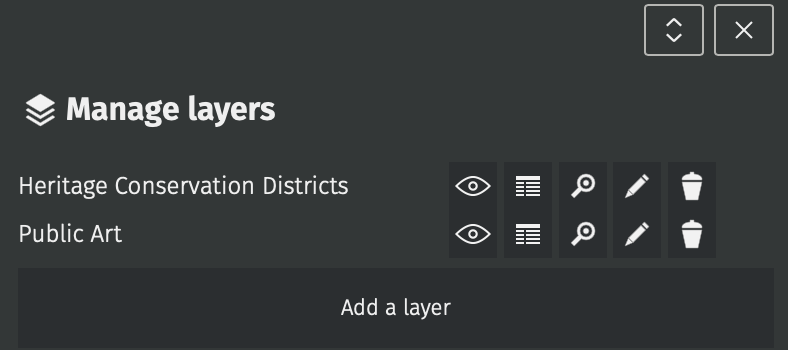 You can manage your layers, including toggling their visibility, updating their symbology, and configuring their pop-ups from the Manage layers tool in the right-hand toolbar.