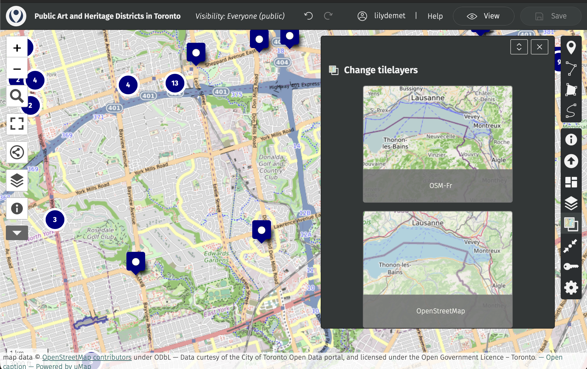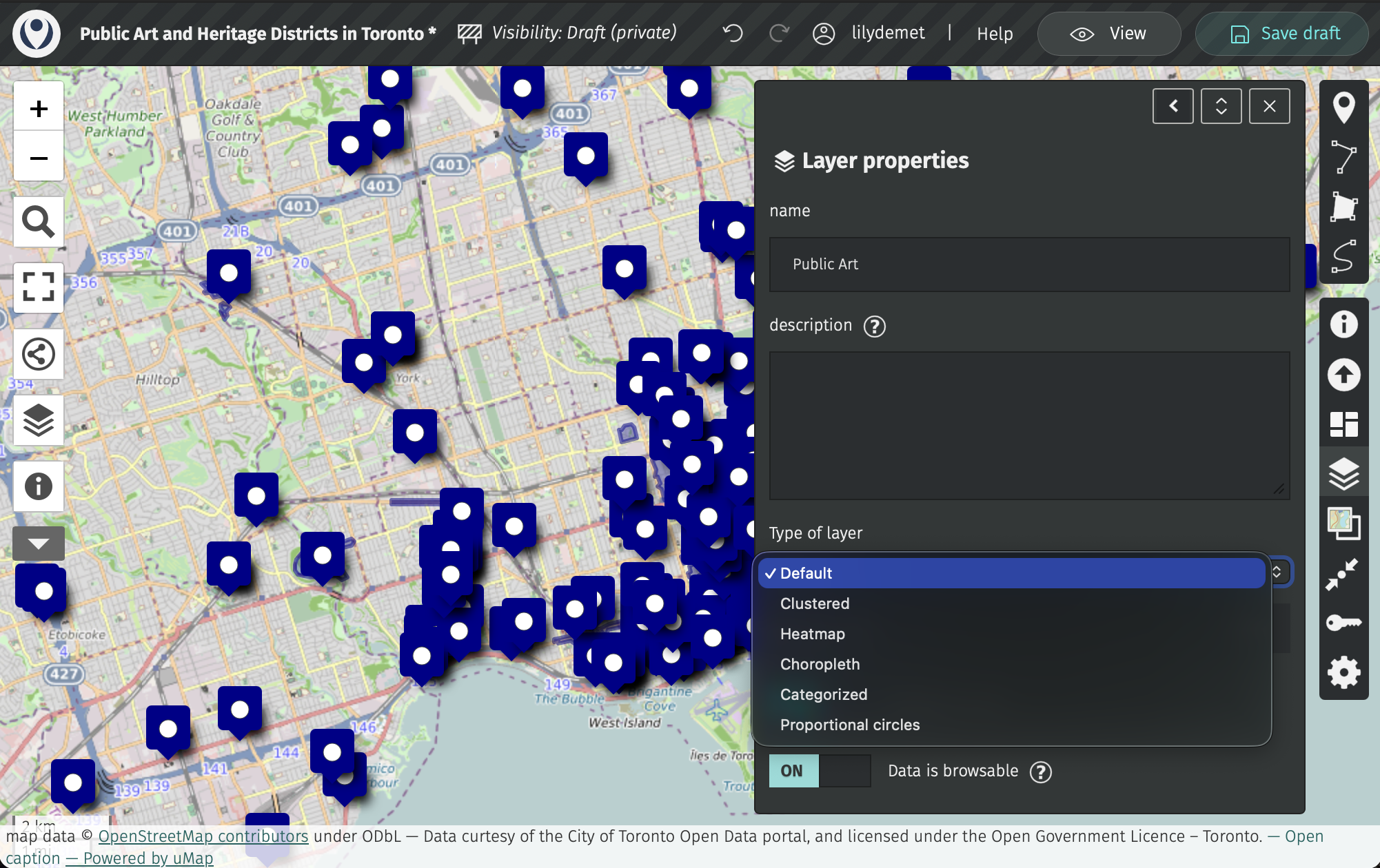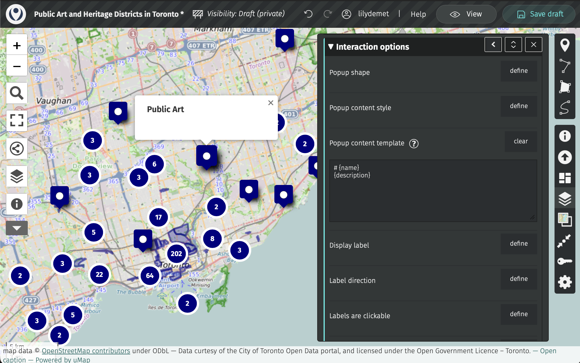 Click on “Untitled map” and replace with your title. Let’s title our map “Public Art and Heritage Districts in Toronto”. In the description, add a data source statement such as: “Data curtesy of the City of Toronto Open Data portal, and licensed under the Open Government Licence – Toronto.” You could also add this in the Credits section.