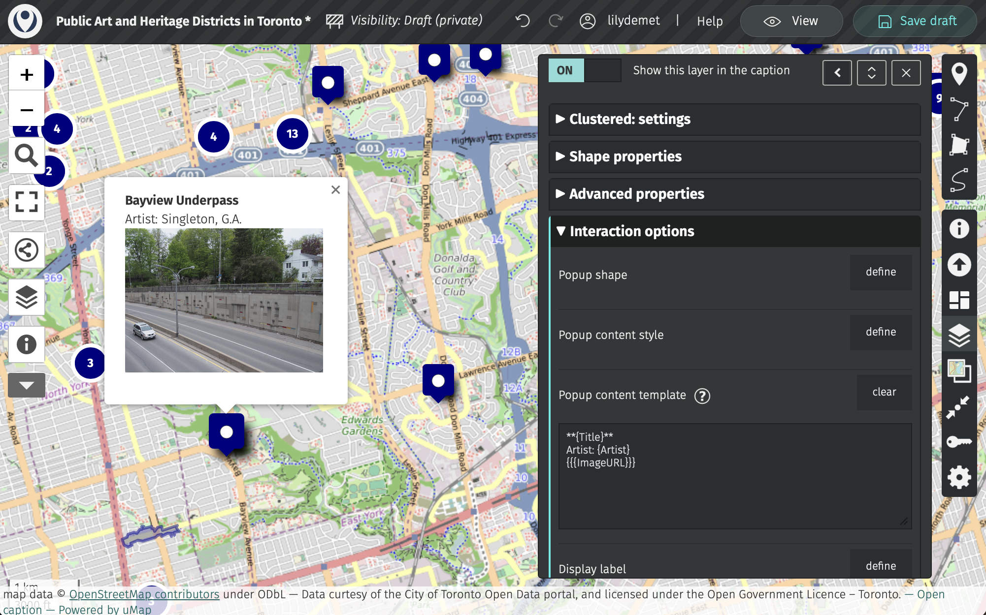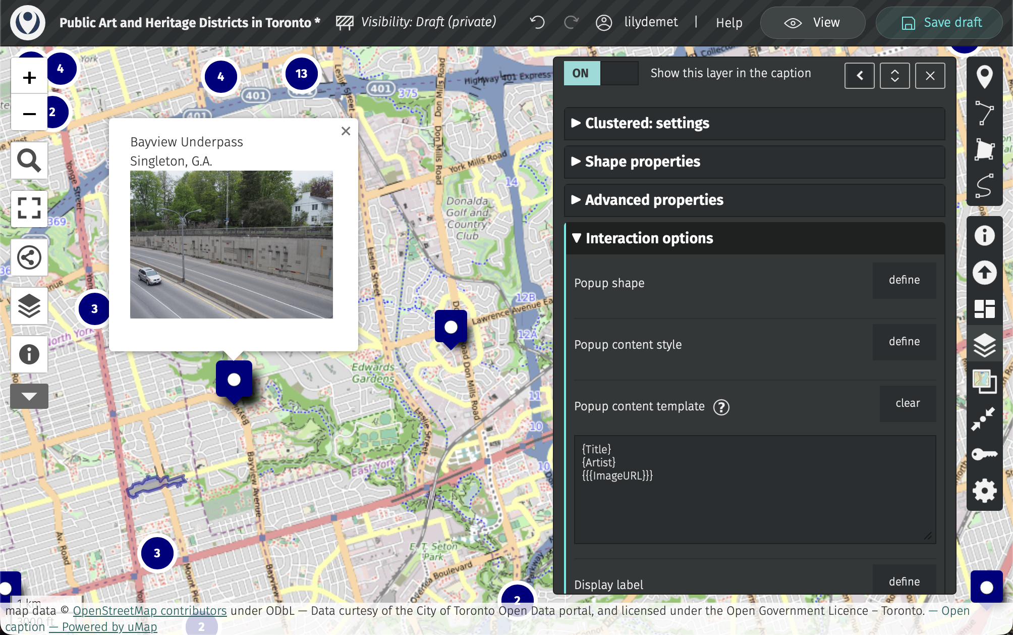 Now, expand Interaction options. As it stands, if you click on any public art feature, you get a pop-up with the name of the layer. Let’s change this so relevant details like Title, Artist, and the artwork image appear in the popup.