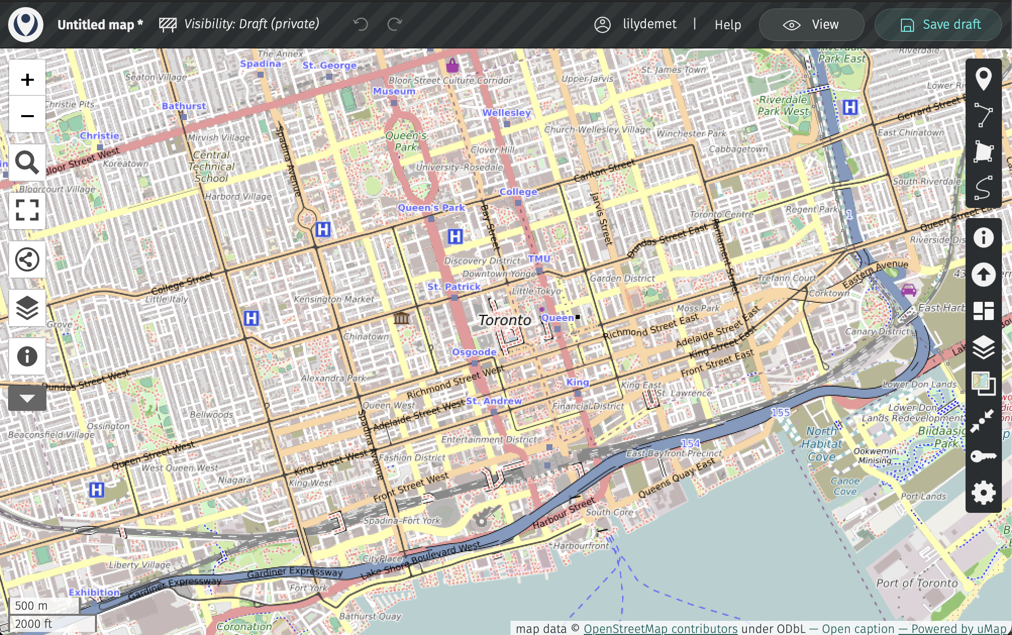 Here is your working interface. Along the top is a menu bar. You’ll notice the visibility is set to private. This will remain so until you go to share it, when you’ll be prompted to update visibility settings so anyone can see it. You can give your map a name, save your draft as you’re working, and preview it as soon as you make any changes.